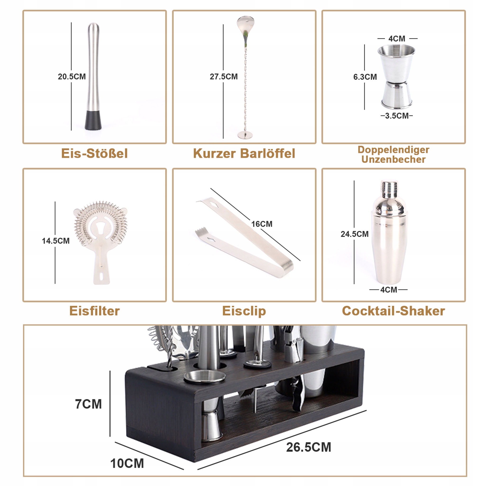 Необходимые аксессуары для смешивания вкусных напитков. Набор включает в себя шейкер коктейлей, палочки с мороженым, ледовые плоскогубцы, барменную ложку, измерение бармена, ситечке с ястребом, настойчивость и нож официанта. Этот профессиональный набор коктейлей позволяет смешивать любое количество напитков. Идеально подходит для тех, кто любит смешивать напитки.