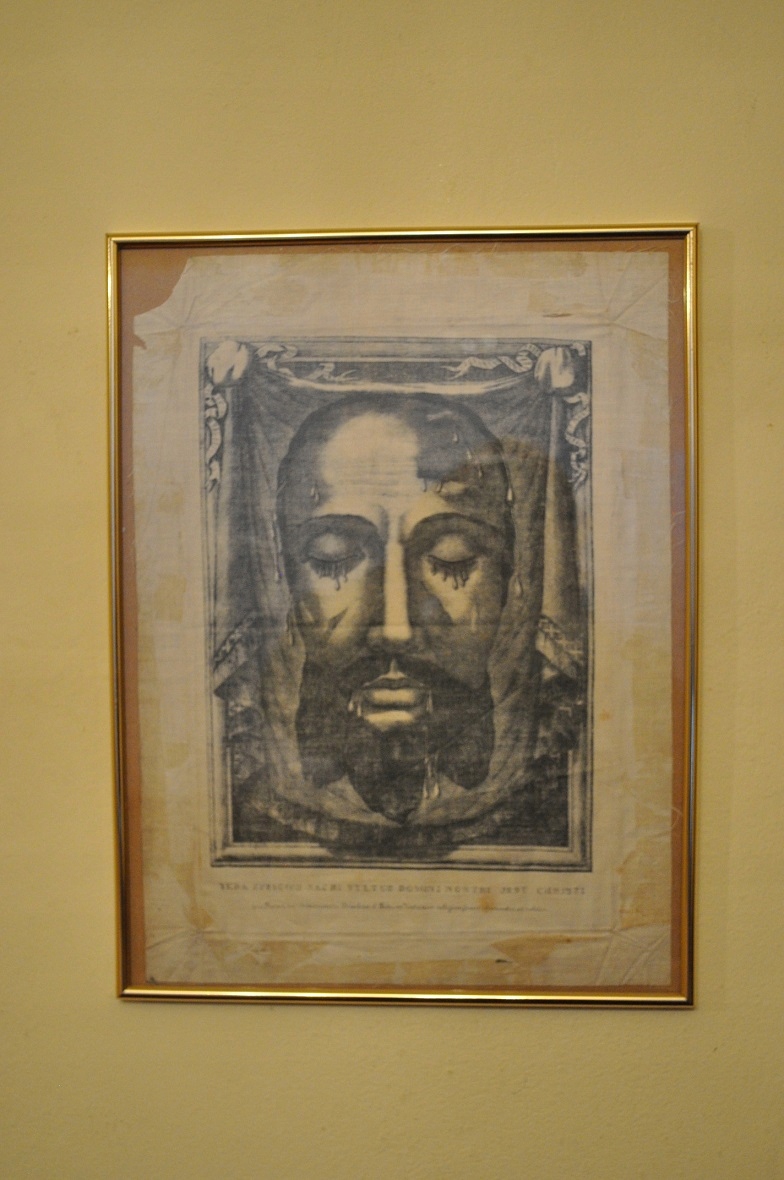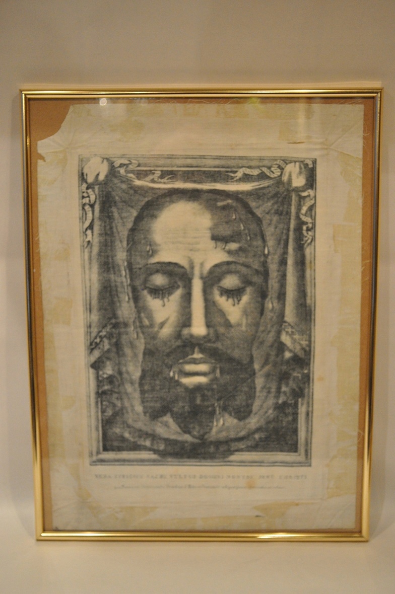 "Черно-белое изображение с изображением Христа, напечатанное на холсте. На нем изображен лик Иисуса, изображенный на фоне платка, закрепленного в обоих верхних углах, изящно драпированного и ниспадающего на бока в виде складок, украшенных лентами.Лик Христа, заполняющий всю композицию, несет следы страданий, большие, закрытые глаза, с текущими слезами, смешанными с кровью, высокий лоб, усеянный каплями крови и пота, короткие волосы туго натянуты. прикрепленный к голове, нос прямой, выдающийся, рот сомкнут, обильные, вьющиеся усы и борода. Композиция окружена прямоугольной рамкой с надписью: "VERA EFFIGIES SACRI VULTUS DOMINI NOSTRI JESU CHRISTI/que Rome Sacrosancta Basilica S. Petri in Vaticano". religiossime osservatur ex colitur» [Изображение истинного лика Святого Господа Иисуса Христа из церкви Св. Петра, одобренное Ватиканом] В правом нижнем углу имеется след красной сургучной печати, скорее всего, печати кардинал.