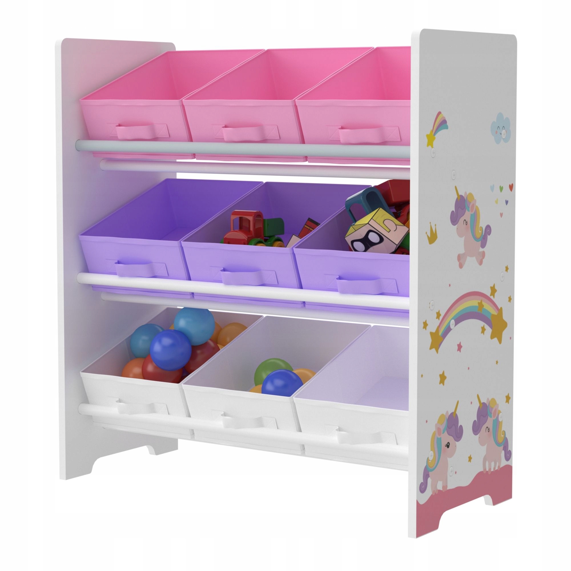 Полка для игрушек идеально подходит для детской комнаты: благодаря девяти складным контейнерам на ней достаточно места для хранения, например, игрушек, мячей и книг. Незаменимый предмет мебели для детей, имеет закругленные углы, что делает его безопасным в использовании.