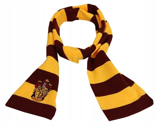 - Шарф в красно-желтую полоску с нашивкой с гербом Гриффиндора,