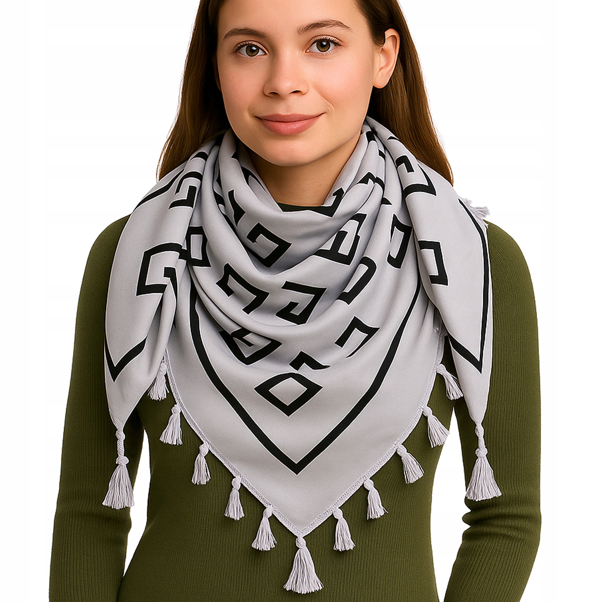Шарф с геометрическим узором – это сочетание классики и современности. Нежный серый оттенок с черными акцентами делает его идеальным дополнением любого стиля – от повседневного до более элегантного. Легкий, воздушный материал обеспечивает комфорт при ношении, а бахрома по краям добавляет шарма. Универсальная форма и размер позволяют носить шарф по-разному – как классический шарф, чехол или украшение сумки.