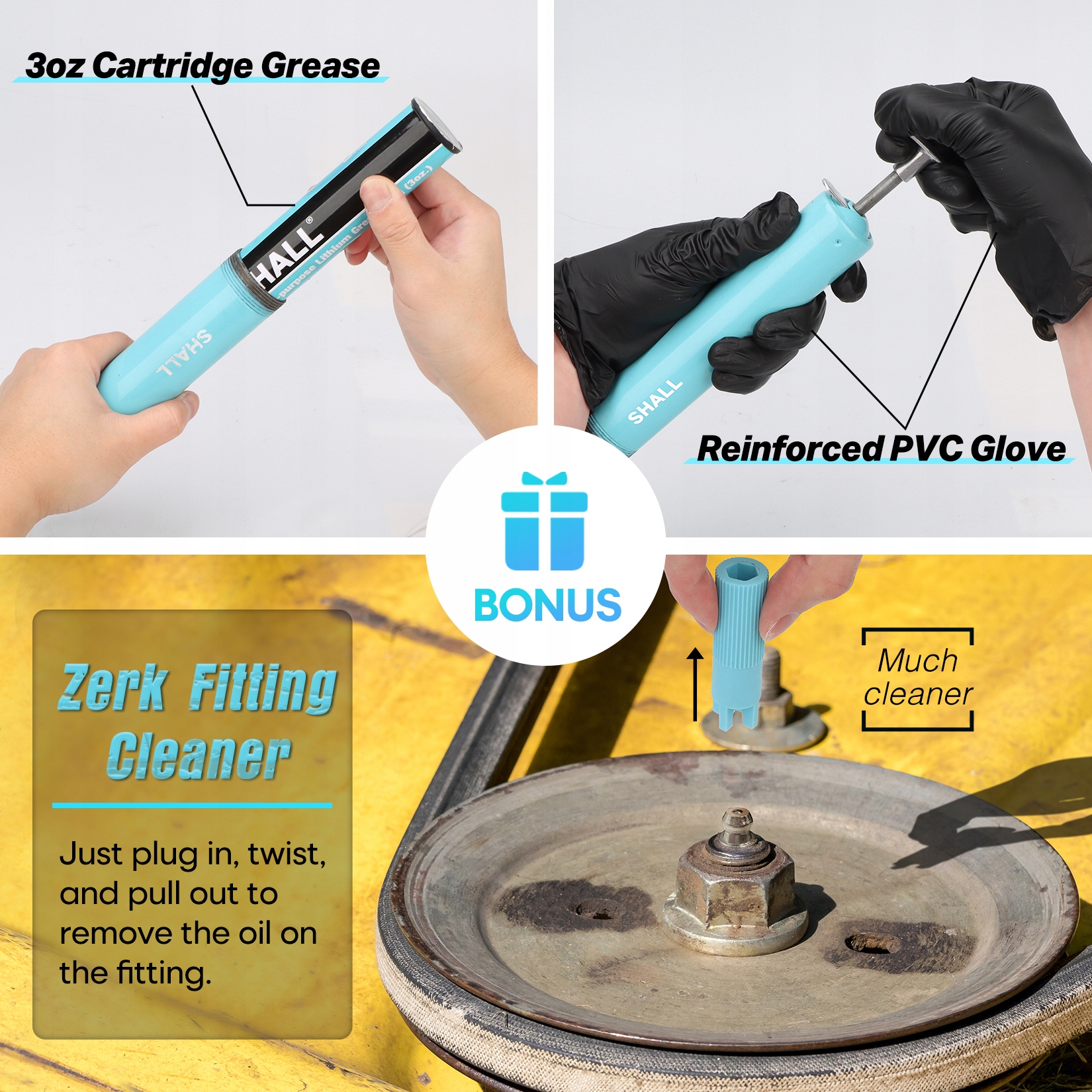 2,3 Типы форсунок: этот набор смазочных материалов содержит 3 типа форсунок, подходящих для большинства транспортных средств, тракторов, мотомов, автомобилей, оси PTO, цилиндров рулевого управления, универсальных суставов, привязки подвески, шариковых соединений, моваков, шасси и полуо акта привода