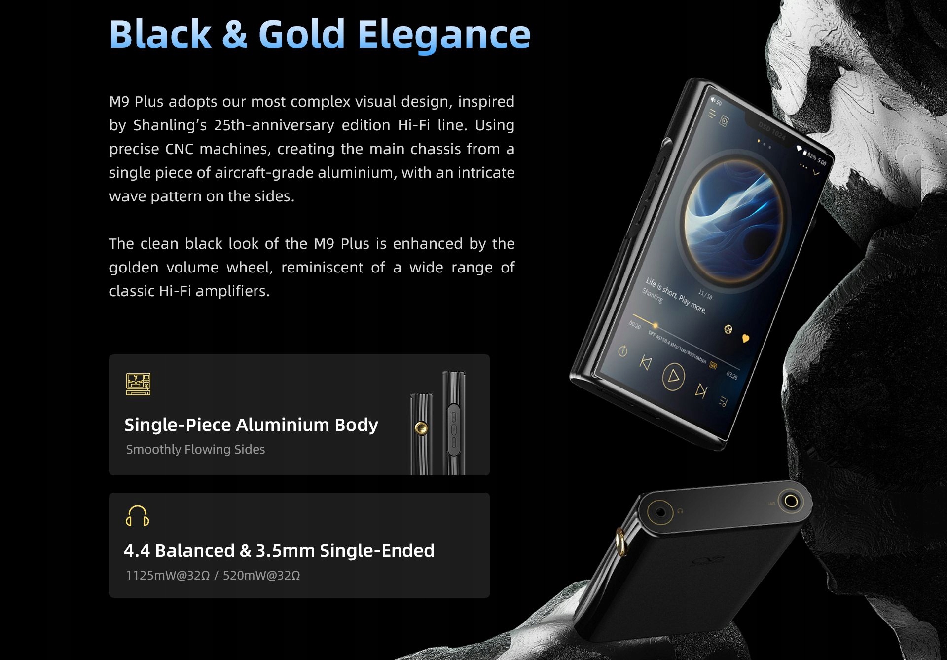 При разработке M9 Plus Шанлин черпал вдохновение в высококачественных продуктах линейки Hi-Fi, созданных к 25-летнему юбилею бренда. Результат работы команды – жилье с красивым дизайном. Он создан из одного куска авиационного алюминиевого сплава с помощью прецизионной машинной резки (CNC), что позволяет получить волнообразные стороны. Shanling M9 Plus имеет элегантную черную поверхность, которая идеально сочетается с золотой ручкой регулировки громкости и украшениями на верхней панели.