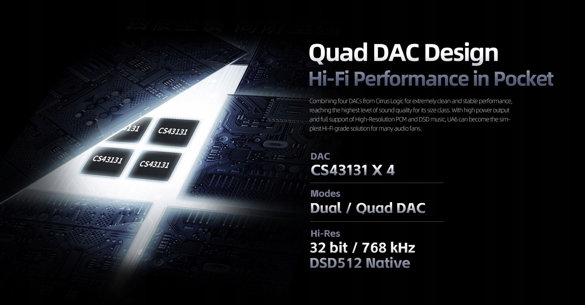 Shanling UA6 основан на целых 4 чипах CS43131, лучших ЦАП-системах от Cirrus Logic. Это позволяет беспрепятственно обрабатывать файлы PCM с разрешением до 32 бит/768 кГц и DSD до 512x и достигать высочайшего качества звука в этом классе размеров. Это естественный, чрезвычайно детальный, чистый и разрешающий звук. UA6 может работать в режиме Dual DAC или Quad DAC, что позволяет выбирать параметры системы в соответствии со сценарием использования.