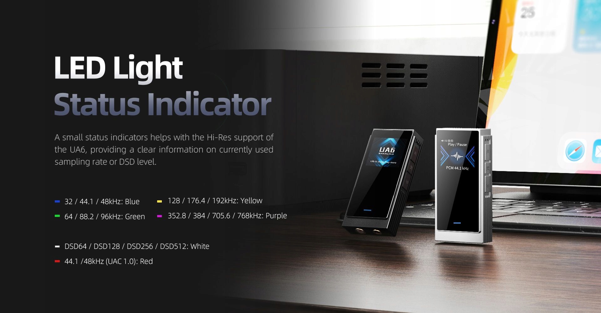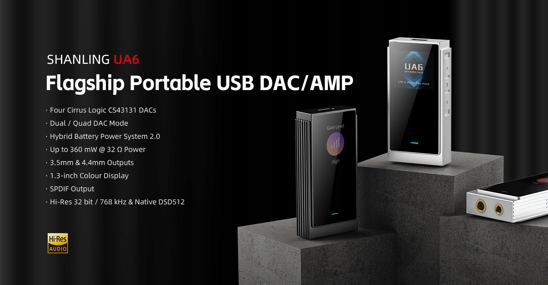 Shanling UA6 — это флагманский портативный ЦАП/Усилитель с функцией усилителя для наушников, который является преемником популярной модели UA5. Новый ЦАП/AMP основан на четырех топовых чипах CS43131, что обеспечивает поддержку файлов PCM до 32 бит/768 кГц и DSD до 512x, а также имеет 3,5 мм и 4,4 мм выходы для наушников. UA6 также имеет обновленный дизайн, новую гибридную систему питания с аккумулятором емкостью 220 мАч, выходной мощностью до 360 мВт, 1,3-дюймовый цветной экран и цифровой выход SPDIF.