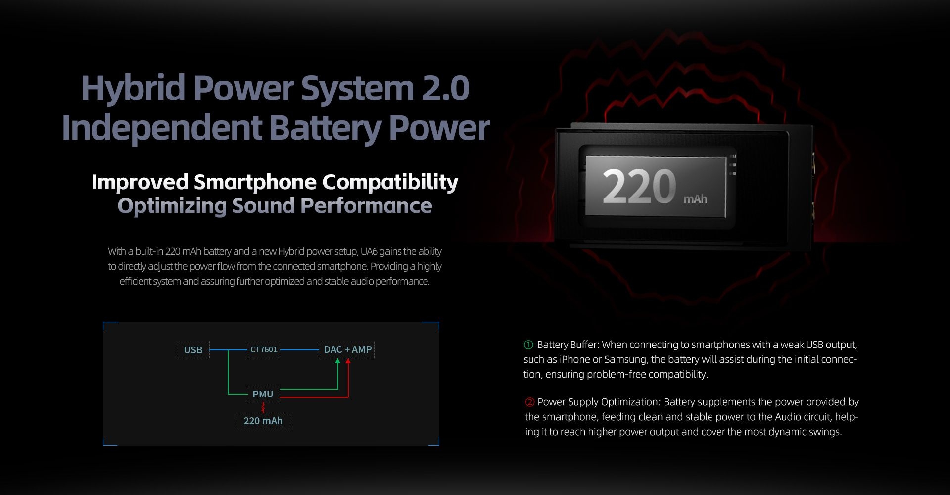Инженеры Shanling Audio разработали новую гибридную систему питания, которая не только обеспечивает более высокое качество звука, но и улучшает совместимость со многими смартфонами. ЦАП/AMP оснащен встроенным аккумулятором емкостью 220 мАч и специальной системой управления энергопотреблением, благодаря чему: