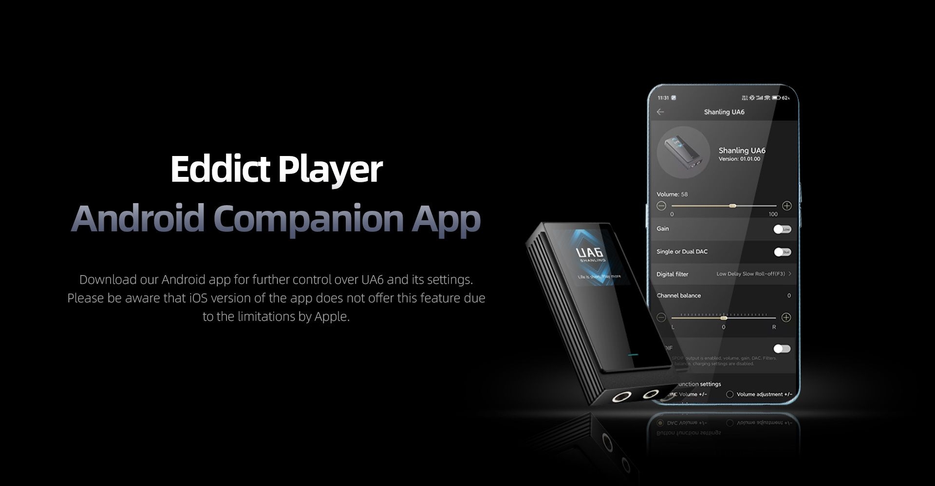 Компания Shanling подготовила мобильное приложение Eddict Player для модели UA6 (и других моделей из этой линейки) для смартфонов на платформах Android и iOS, позволяющее управлять функциями DAC/AMP. Благодаря ему вы можете выбрать уровень усиления, любимый цифровой фильтр, режим ЦАП или соответствующий баланс канала.