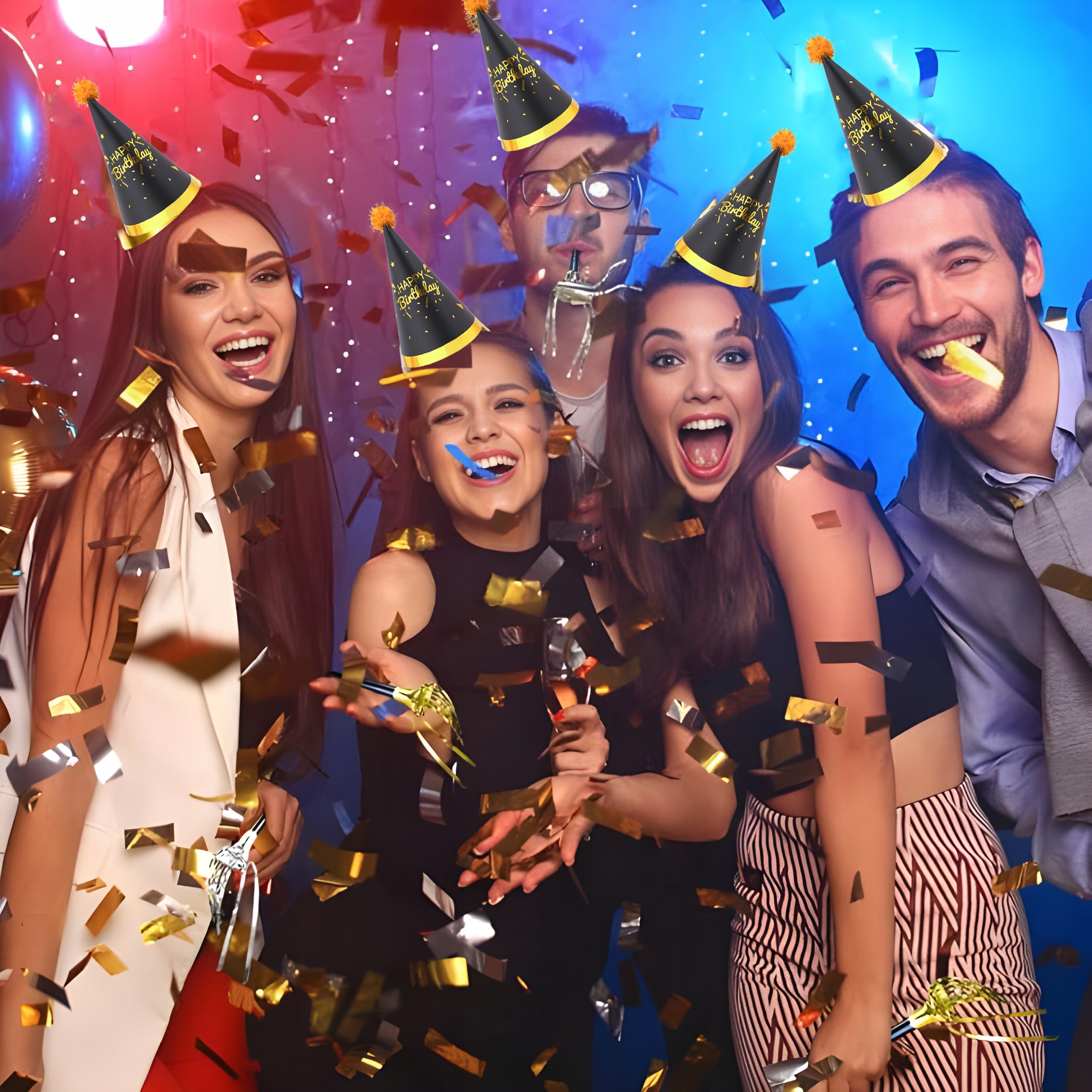 Золотые черные шляпы "С Днем Рождения" - это не только практическое дополнение, но и уникальный декоративный элемент, который различит ваше мероприятие. Стильные и блестящие - они будут работать как на детских вечеринках, так и на элегантных днях рождения взрослых.
