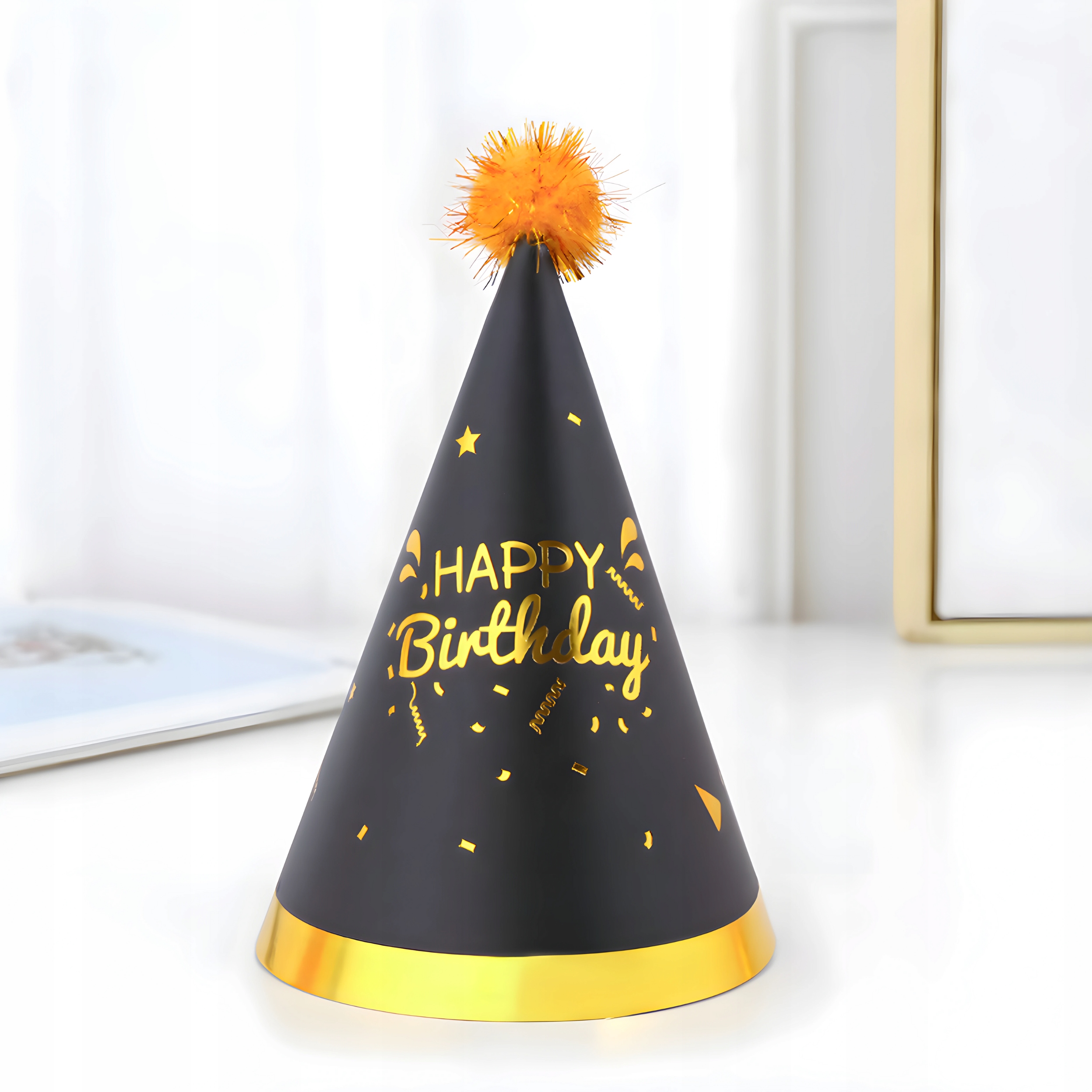 Каждая шляпа украшена блестящей золотой надписью «С Днем Рождения» и элегантным золотым ободом, который прекрасно отражает свет. На вершине есть апельсиновый помпон - веселый и декоративный акцент.
