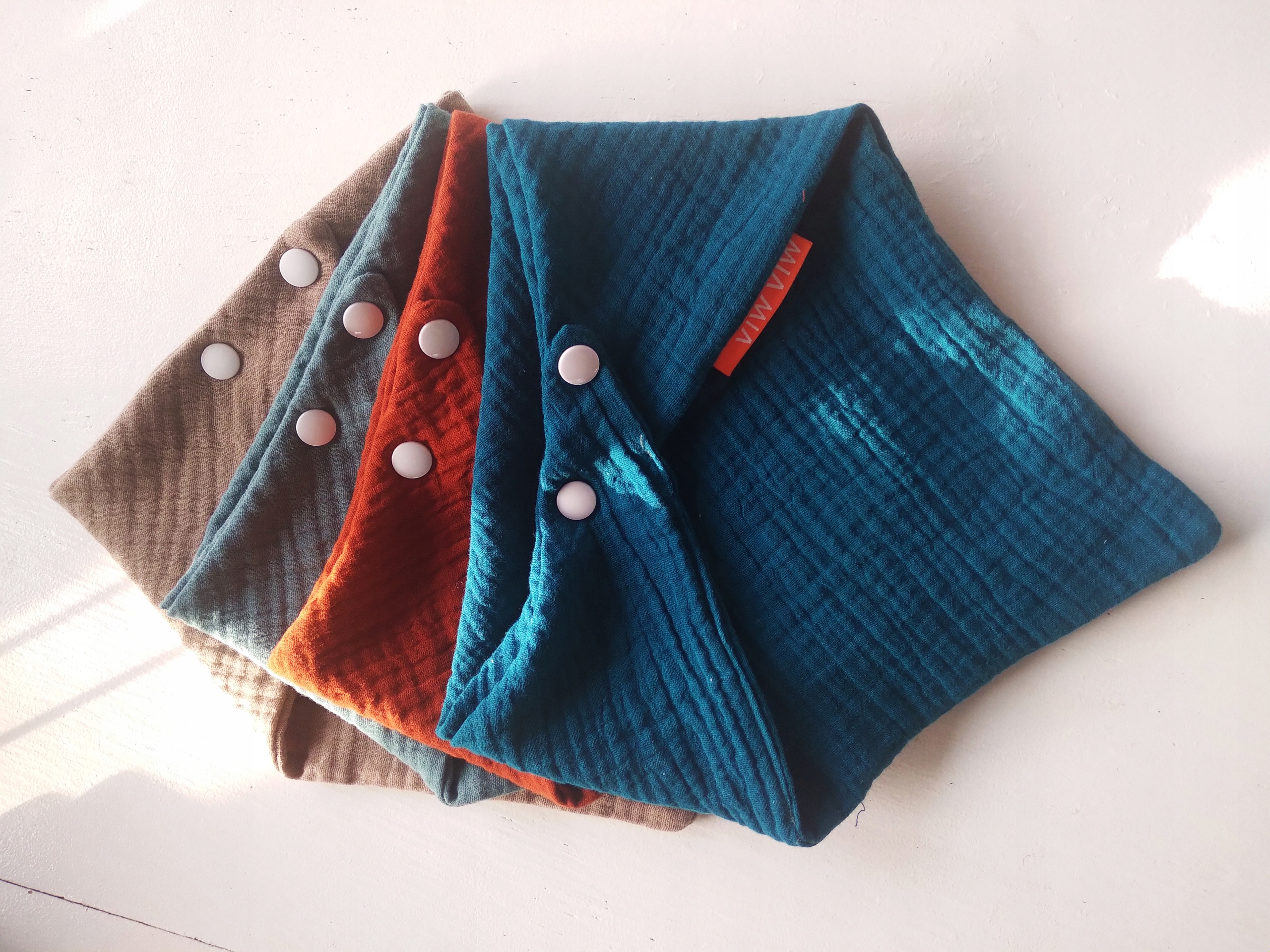 - Двусторонний шарф-повязка на шею, выполнен из комбинации 2 слоев 100% хлопкового органического муслина, мягкий и идеально подходящий для нежной детской кожи.