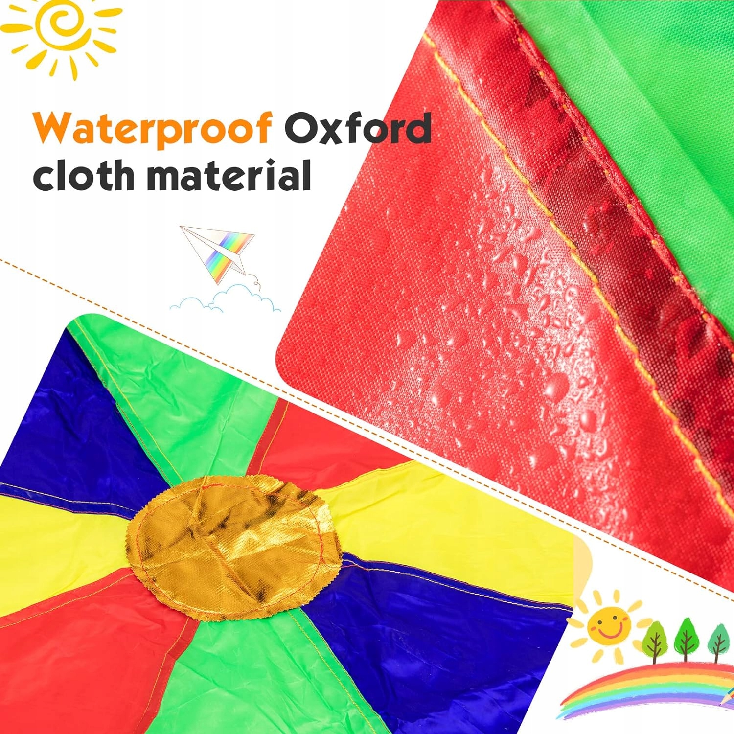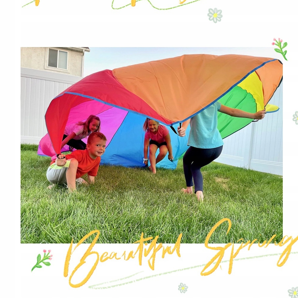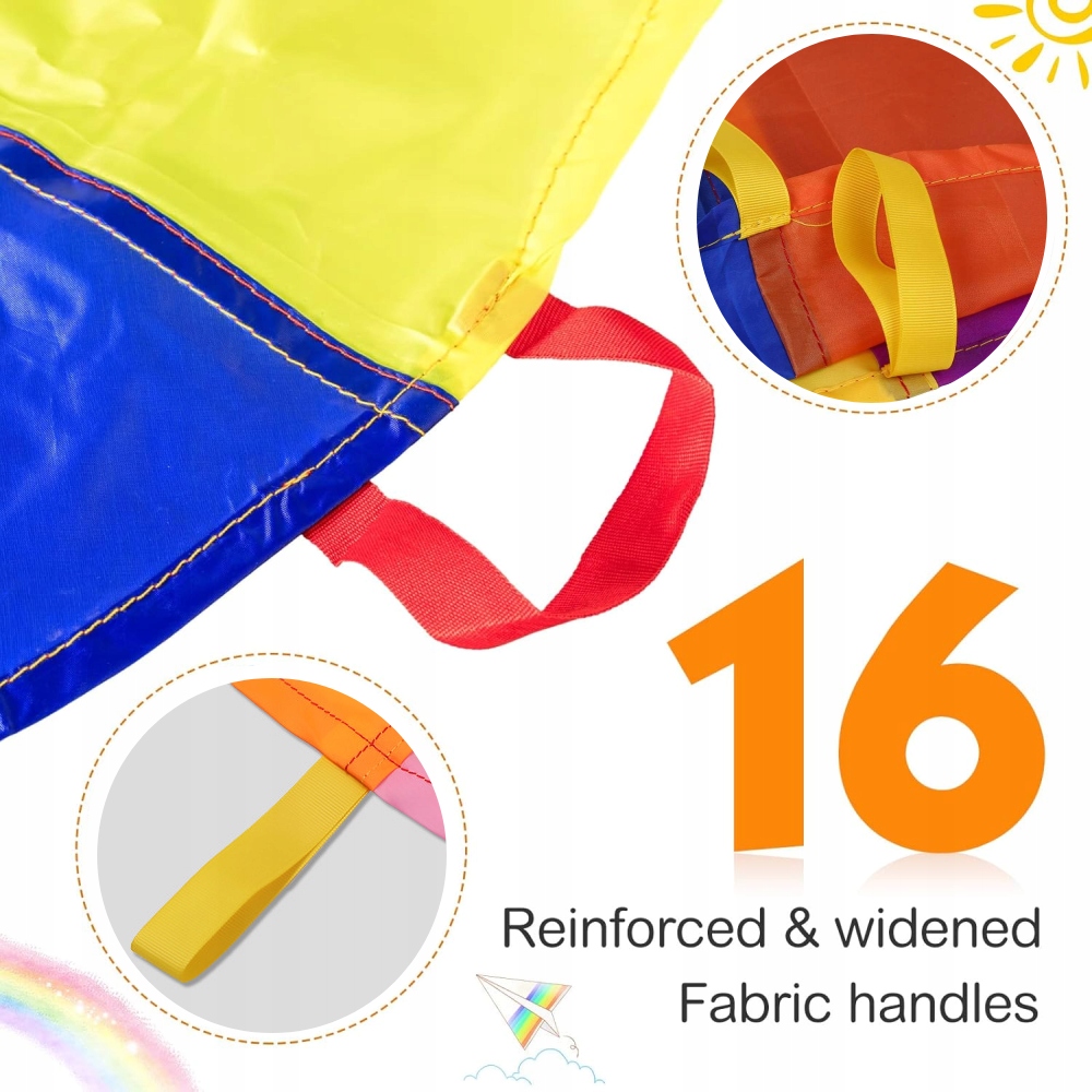 Диаметр детского парашюта составляет около 3,6 м (12 футов), он имеет 16 больших и хорошо заметных ручек.