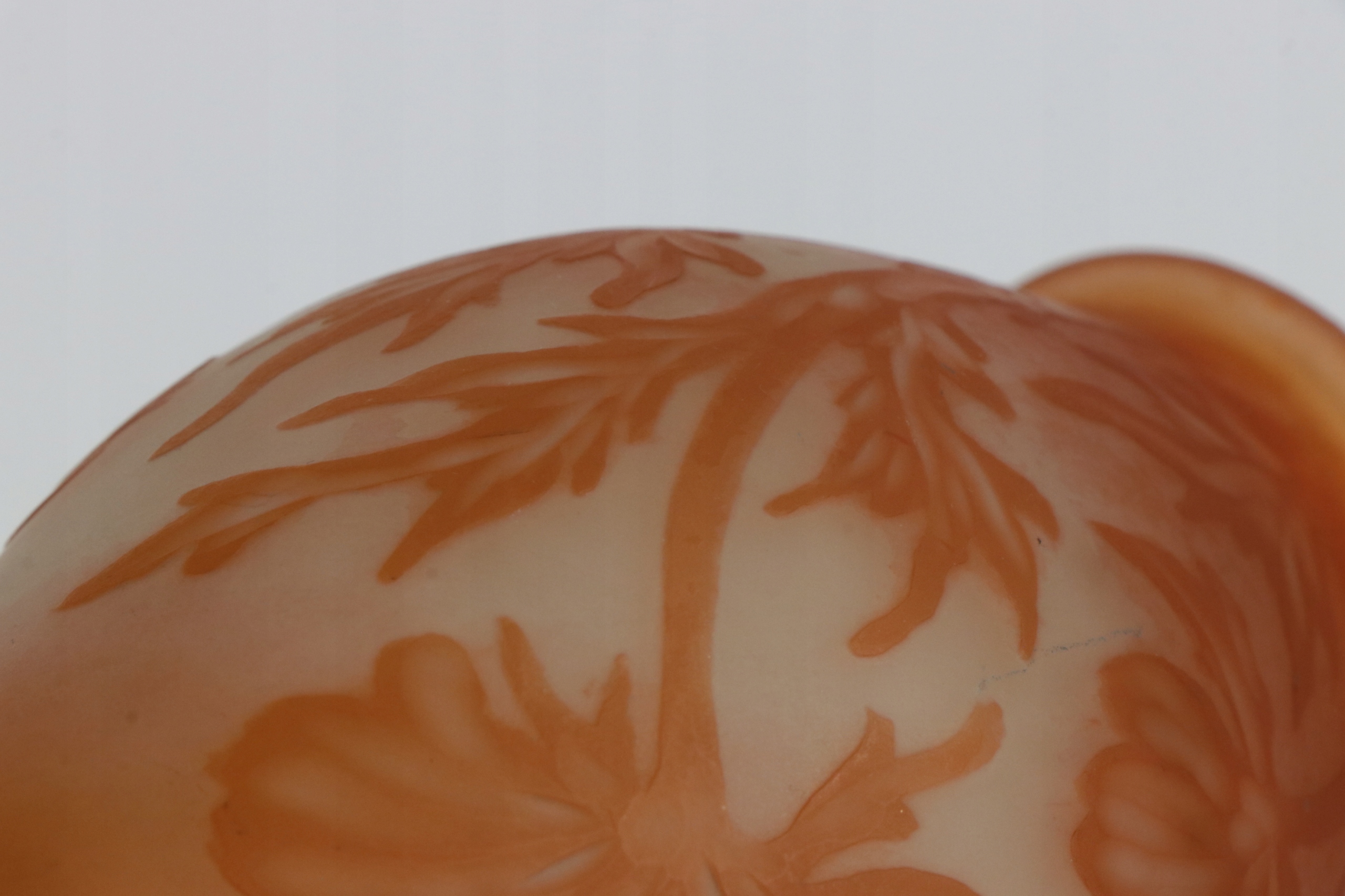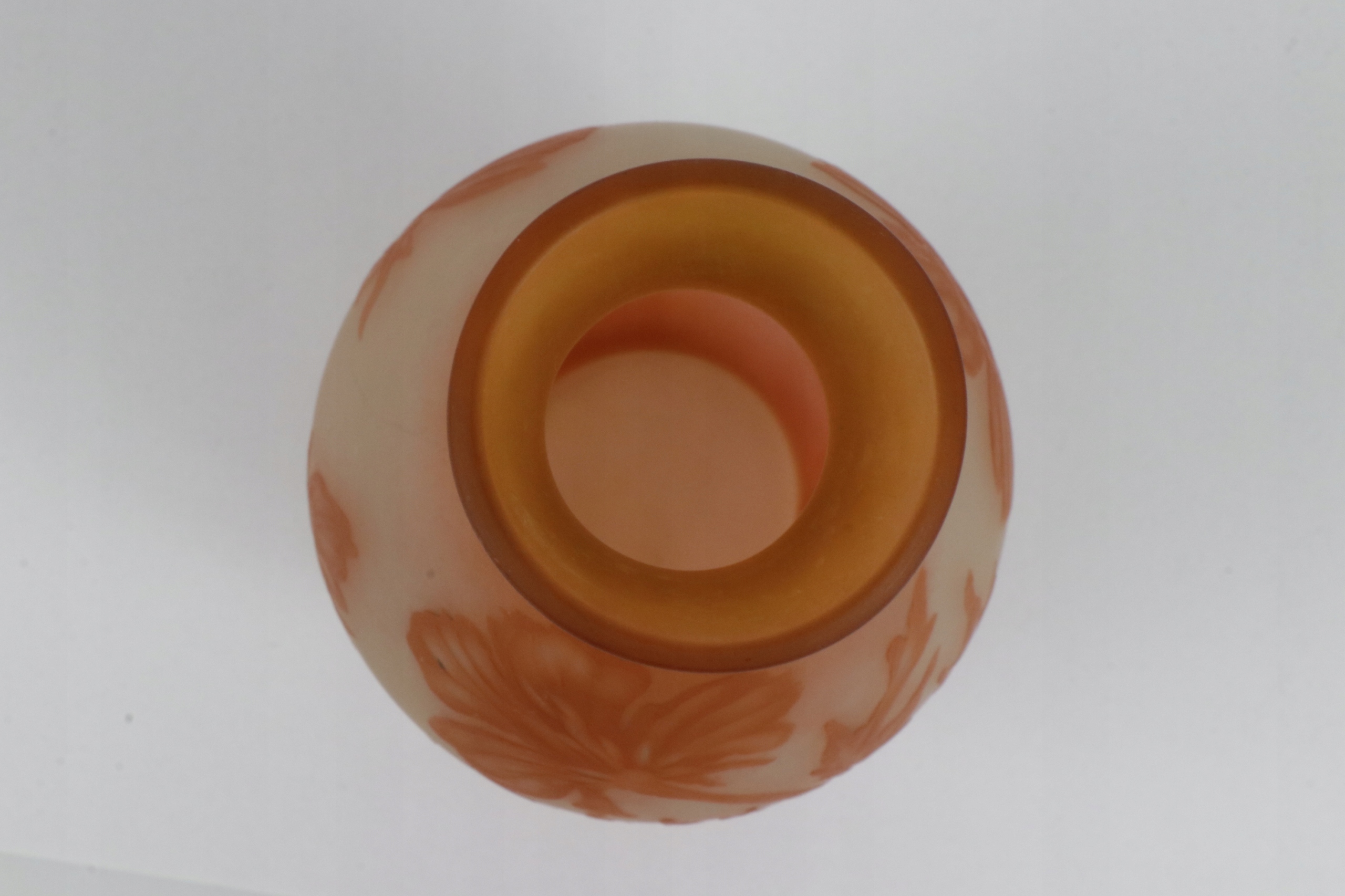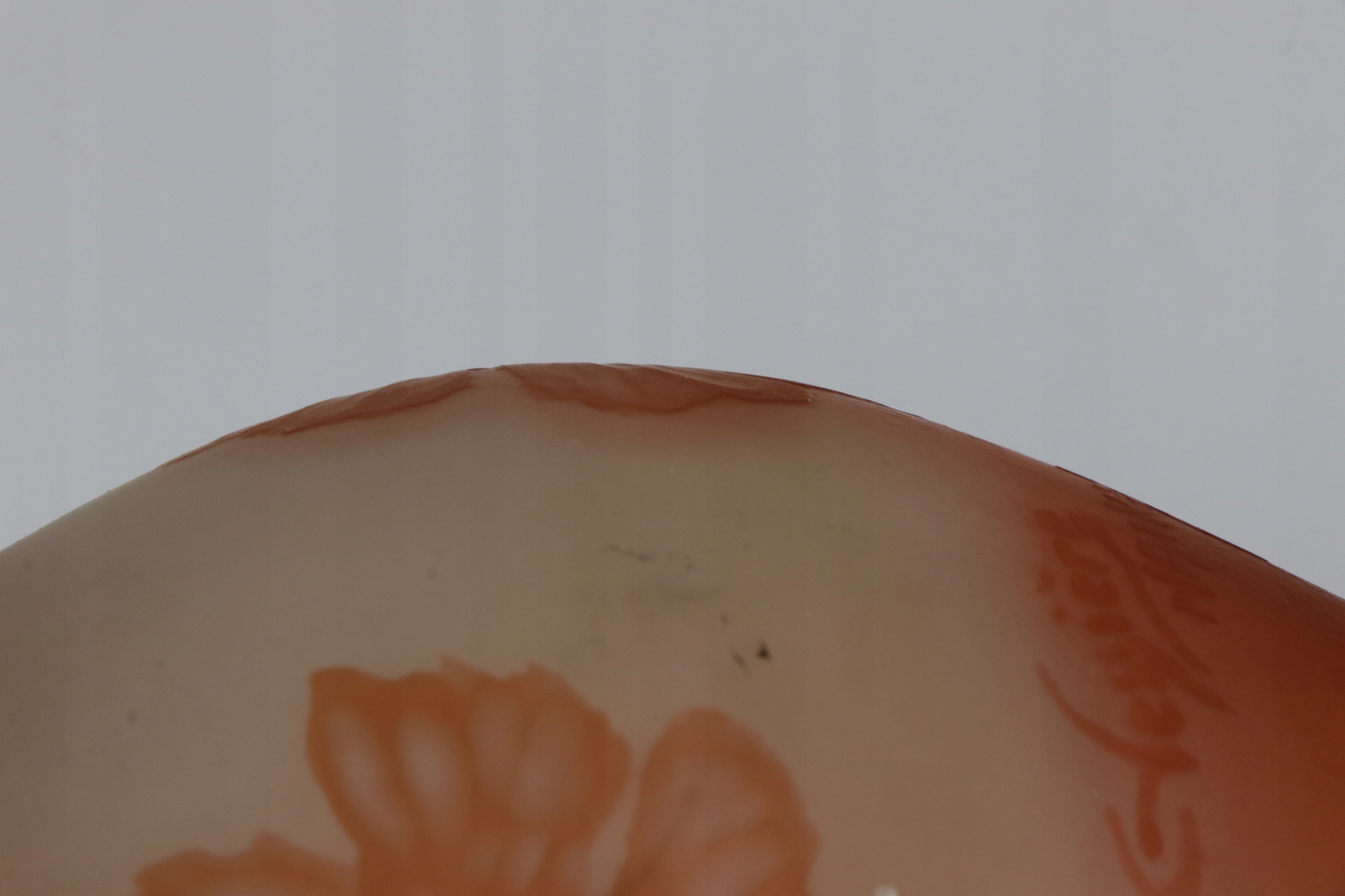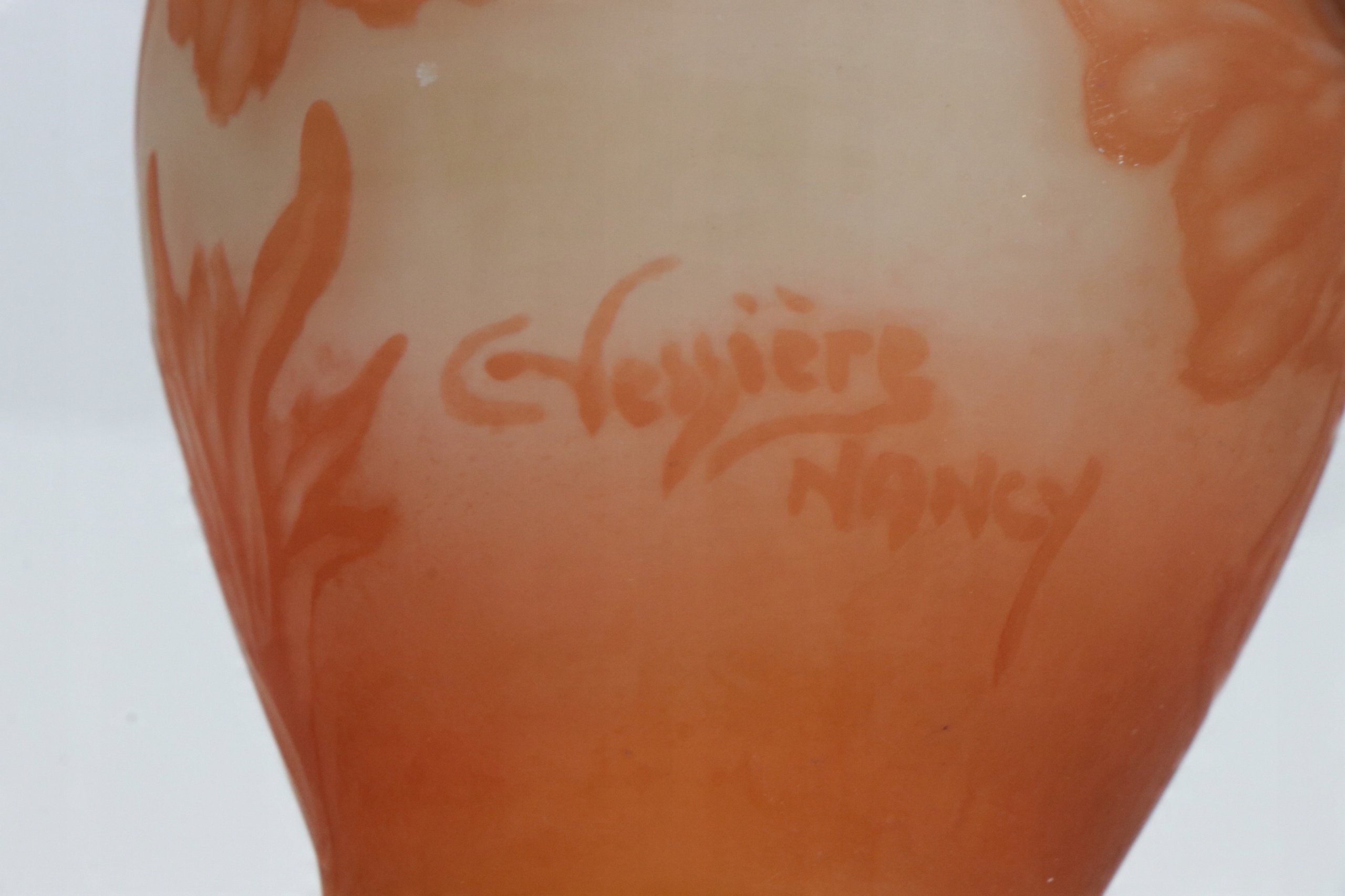 Очень интересная ваза с орнаментом из травленого стекла. Ваза подписала Шарля Вессьера Нэнси. Травленое многослойное стекло, внутри матовое белое, снаружи слегка оранжевое.