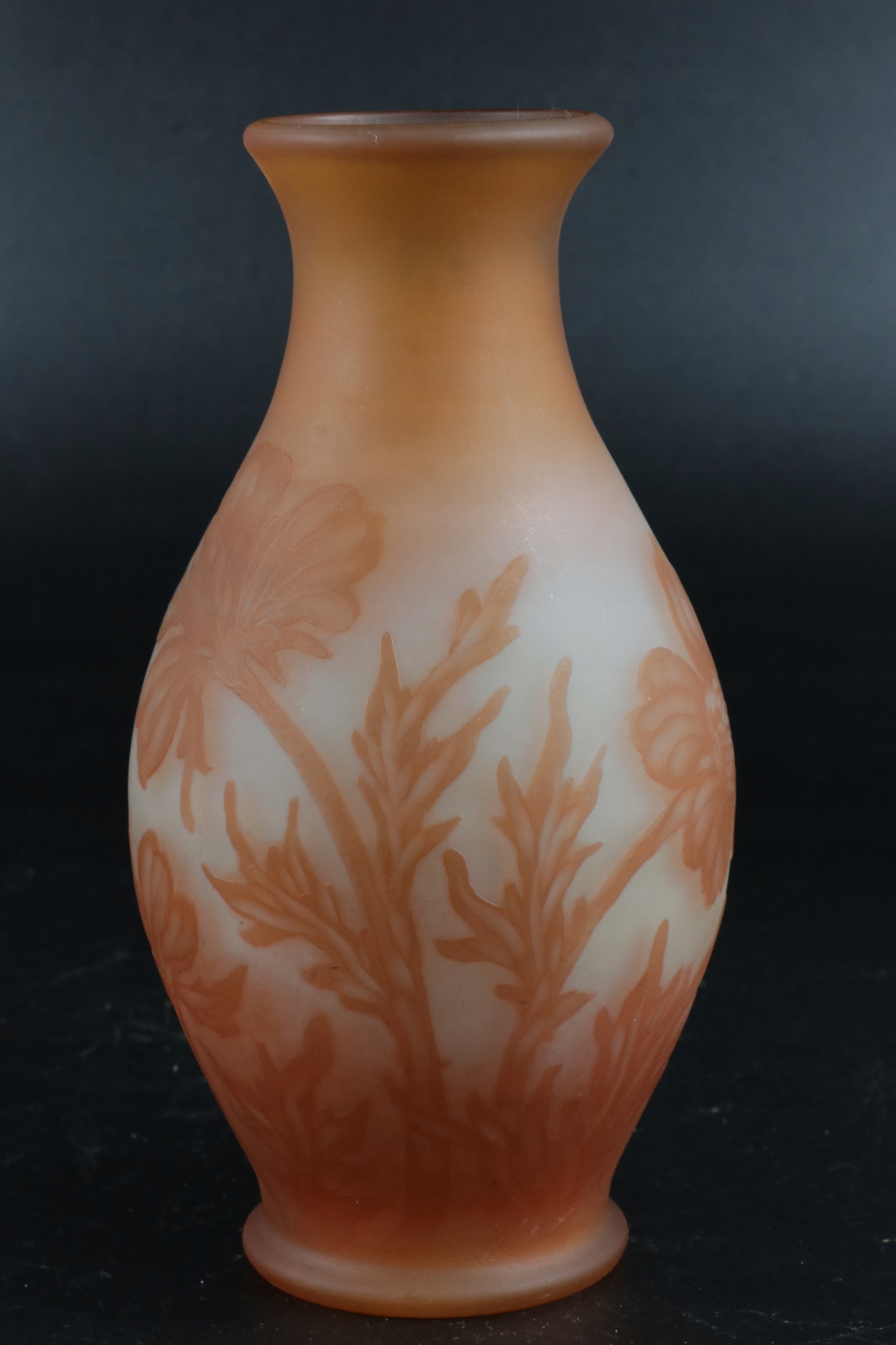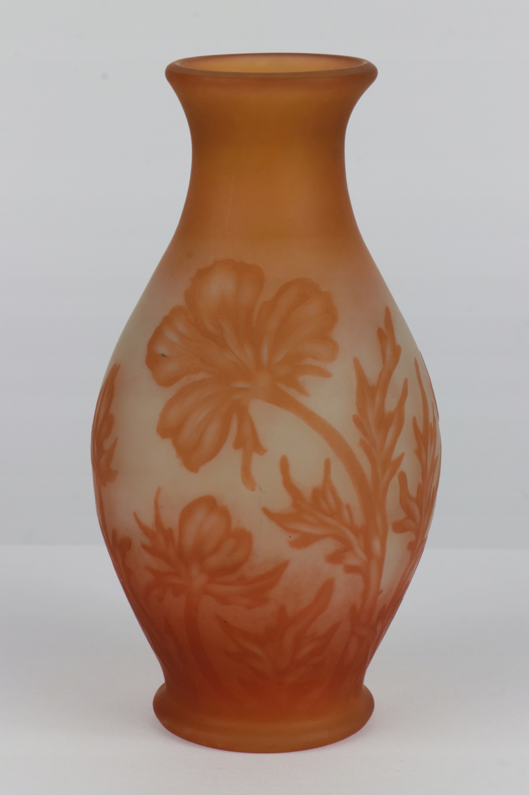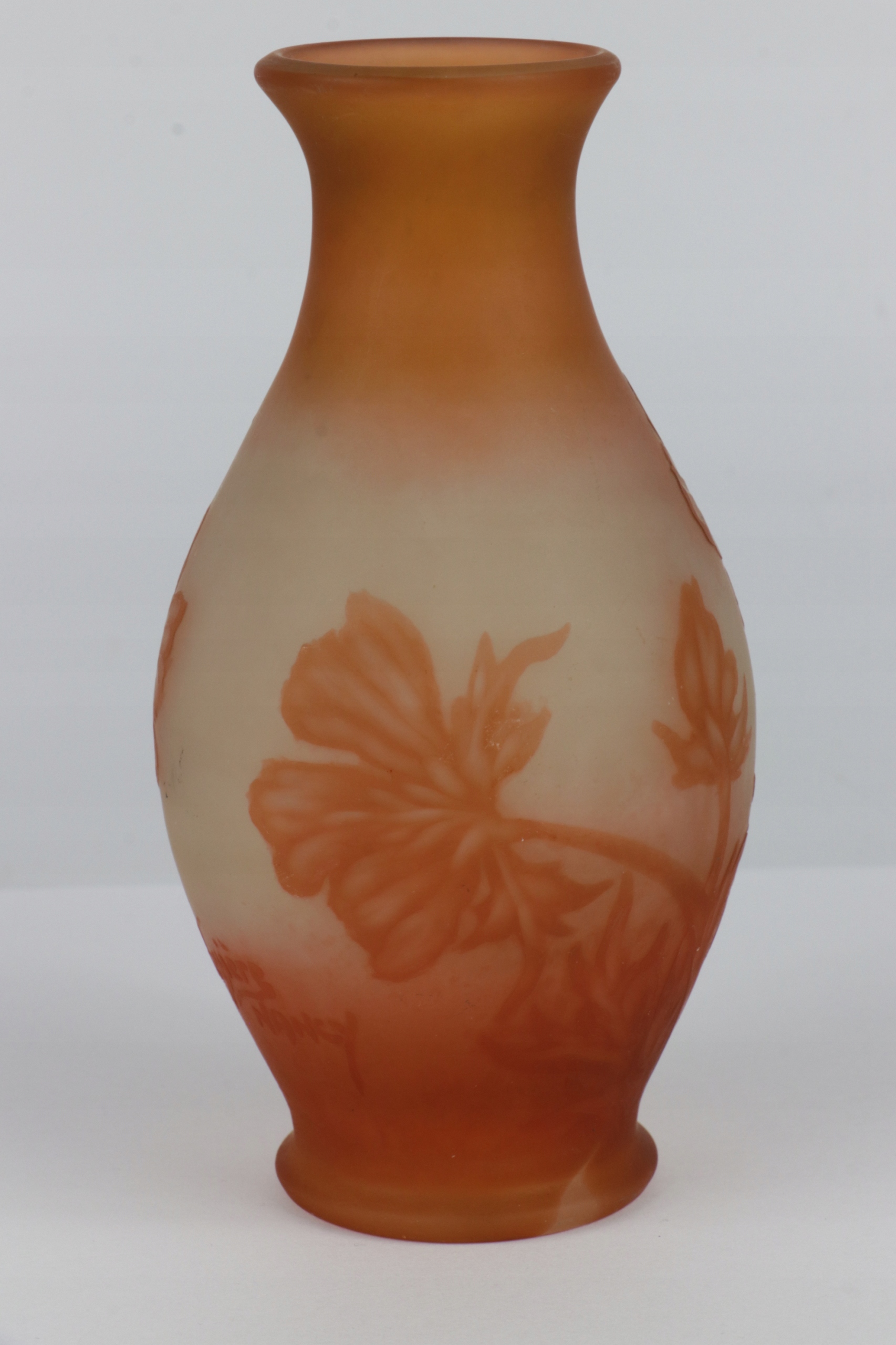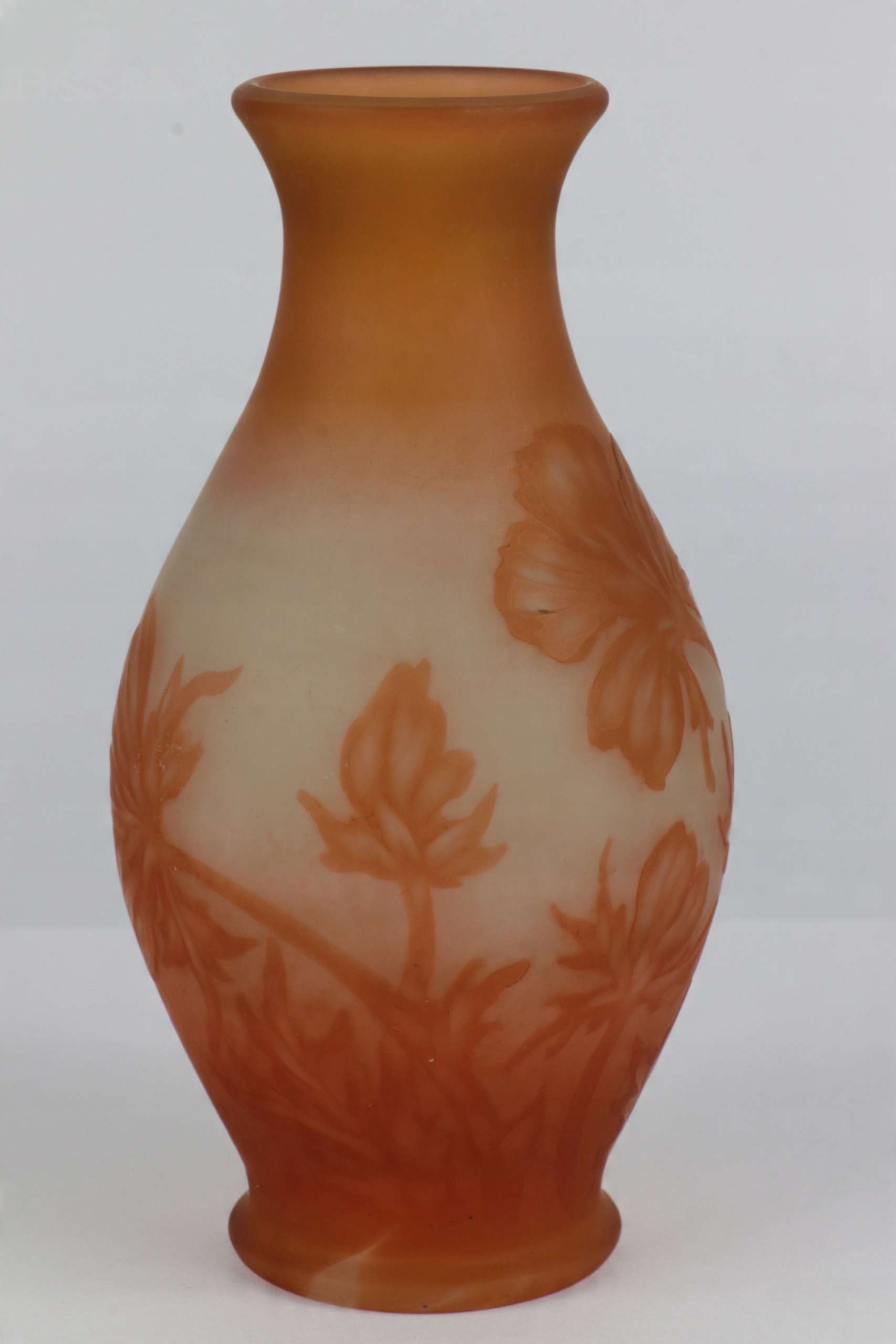 Очень интересная ваза с орнаментом из травленого стекла. Ваза подписала Шарля Вессьера Нэнси. Травленое многослойное стекло, внутри матовое белое, снаружи слегка оранжевое.