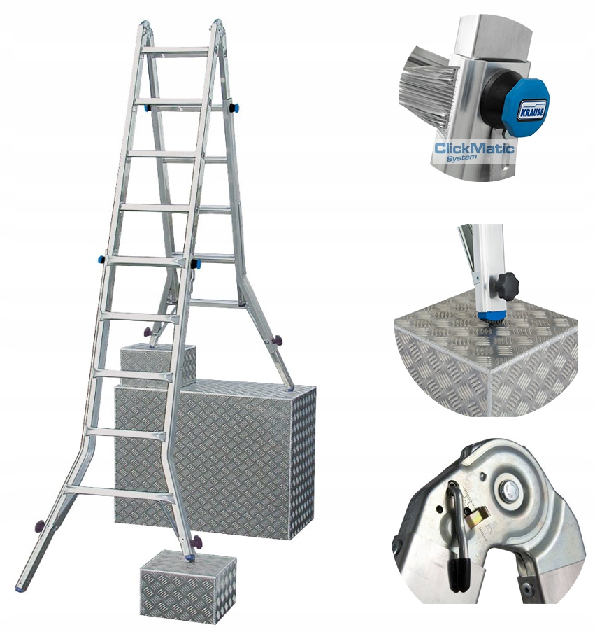 Профессиональная шарнирно-сочлененная телескопическая лестница марки KRAUSE серии STABILO – это настоящий многофункциональный талант. Она хорошо работает в качестве наклонной лестницы, отдельно стоящей лестницы или рабочей платформы.