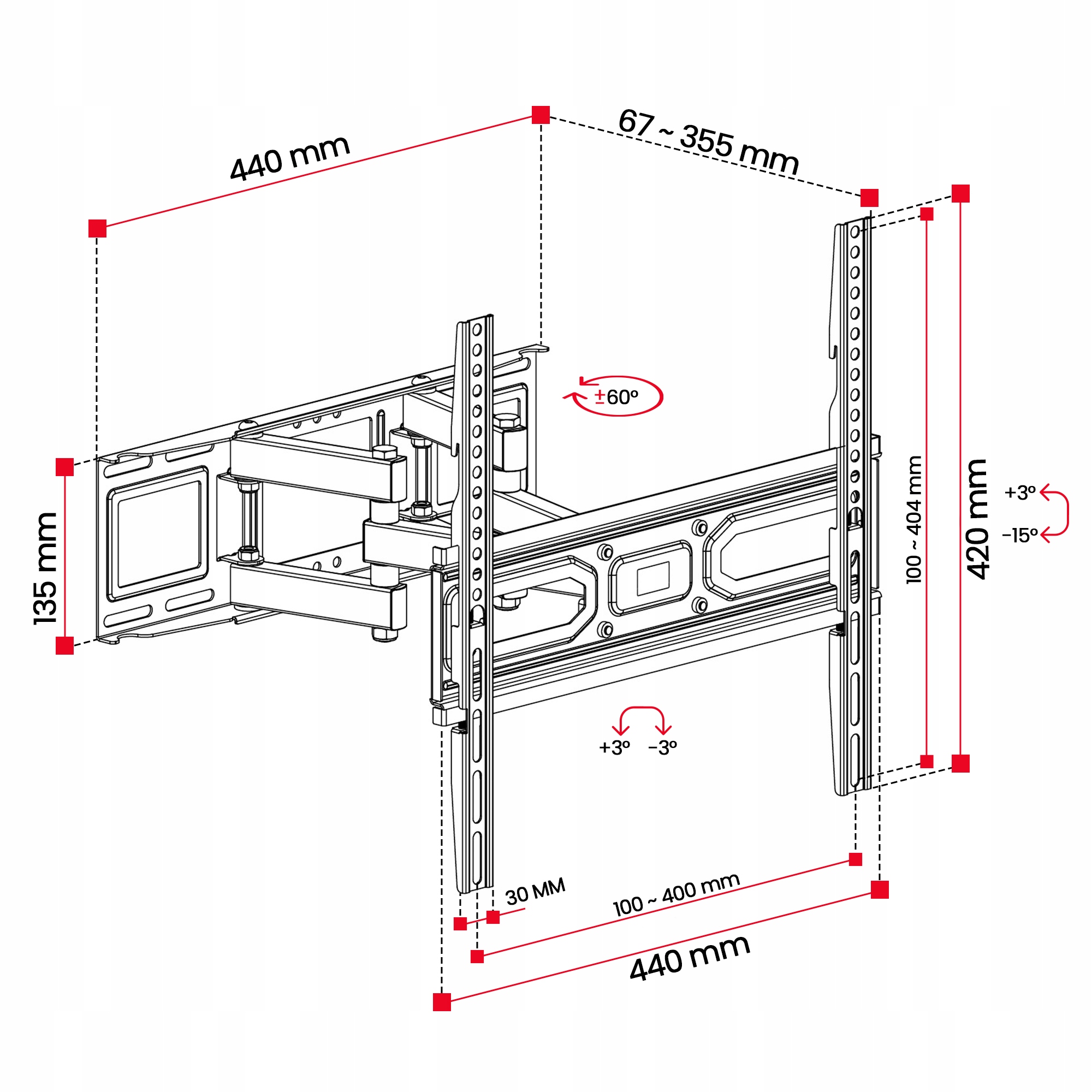 вешалка позволяет регулировать наклон - вверх и вниз от 3 ° до -15 ° . Благодаря этому вы можете легко настроить положение телевизора в удобное положение, независимо от того, расслабляетесь ли вы на диване или упражнениях перед телевизором.