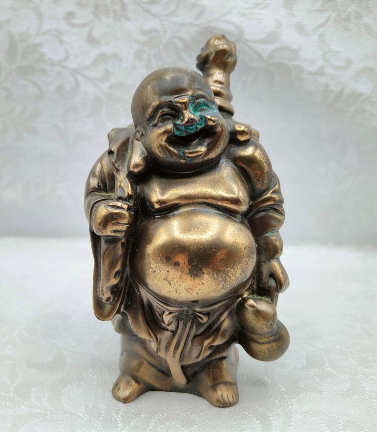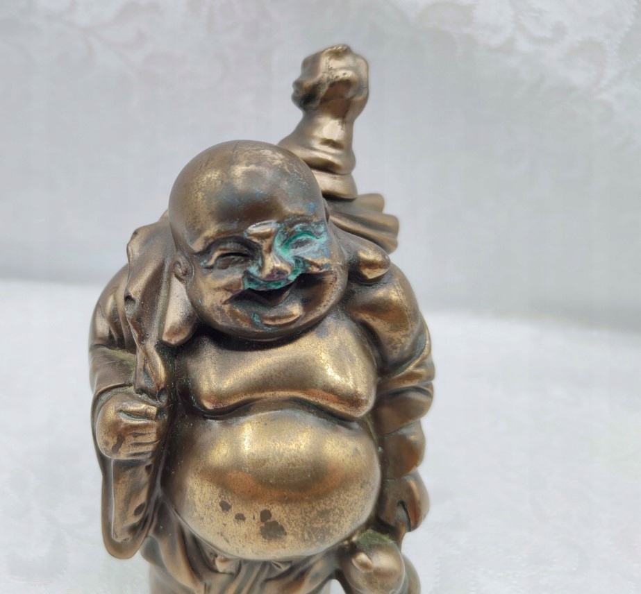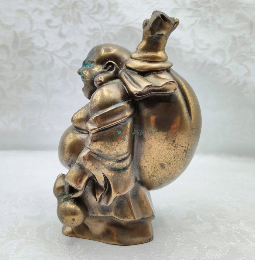 Старая статуэтка, счастливая толстая будда с мешком на квадратах, материал, из которого он был сделан, напоминает бронзу!
