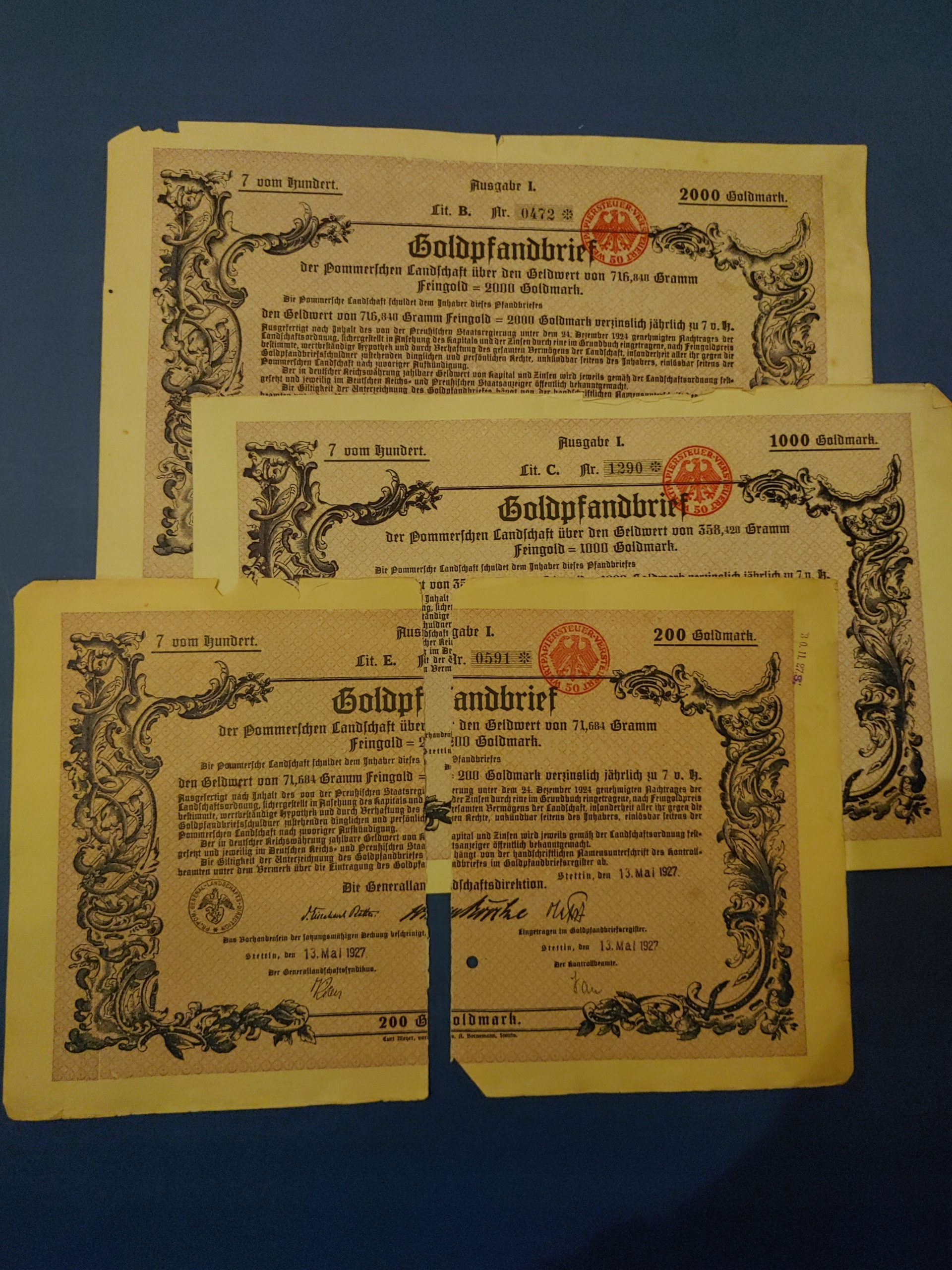 Щецин, 3 золотые ипотечные облигации 1927 года выпуска, выпущенные Поморской землей в Щецине, т.е. на 200, 1000 и 2000 золотых марок.