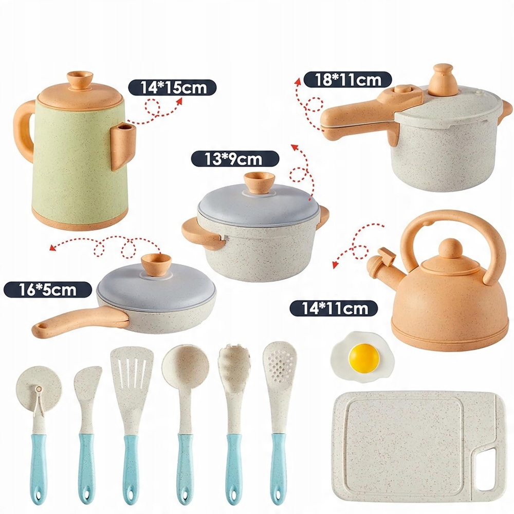 - - В комплект входят скороварка, сковорода, кастрюля, чайник, чайник, разделочная доска, яичница и другая посуда, чтобы дети могли веселиться.