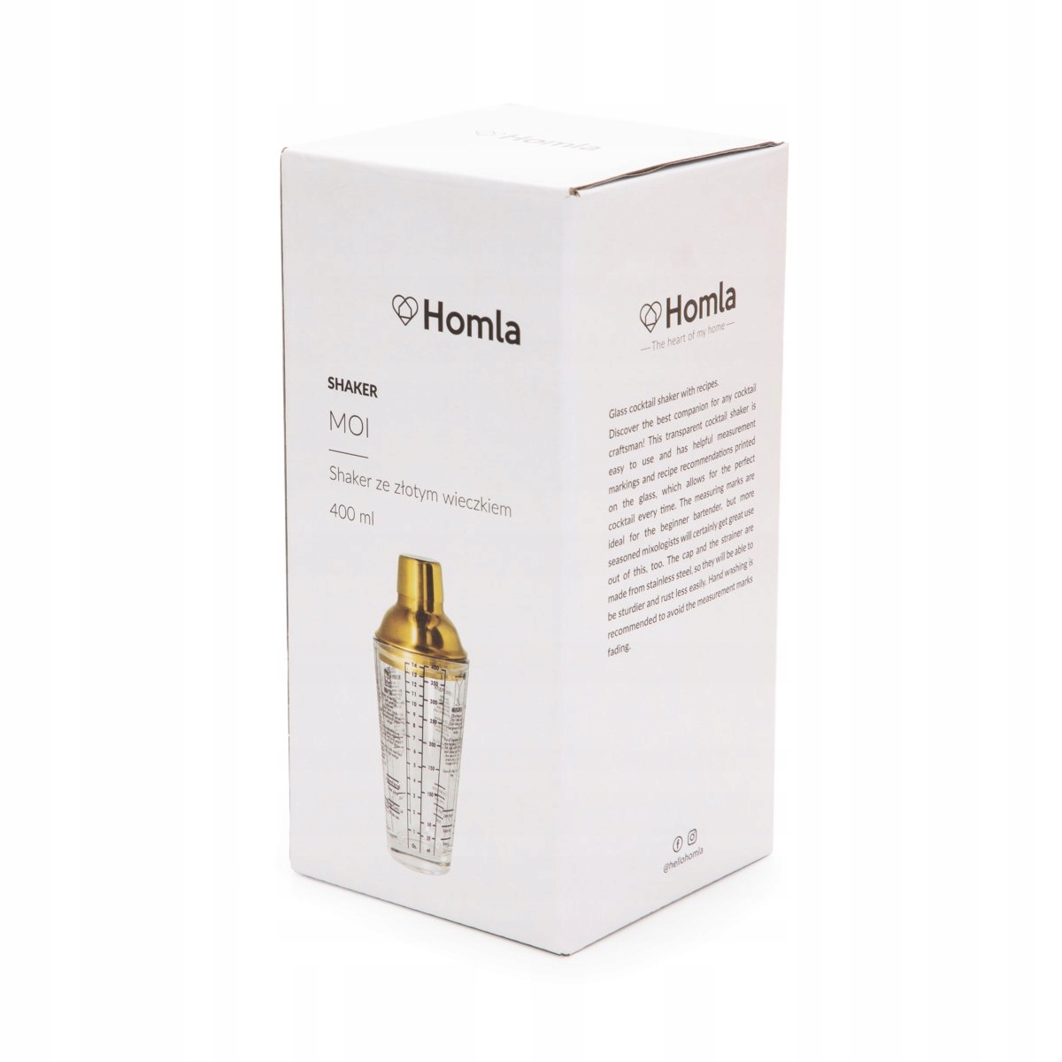 MOI Shaker представляет собой изделие, состоящее изтрех частей. Его основа — прозрачная бутылка с полезными принтами. Там вы найдете мерки, чтобы узнать, сколько мл содержит ваш напиток, и целых шестьрецептов вкусных алкогольных напитков. Еще одним элементом изделия является золотая крышка, которая плотно закрывает шейкер благодаря силиконовой резине внутри. Последняя часть изделия — съемная голова с декоративным логотипом «Хомла». Емкость шейкера0,4л