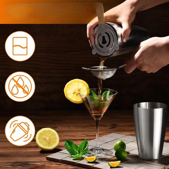 - В наборе шейкера достаточно аксессуаров, поэтому вам не нужно покупать другие ненужные аксессуары для барных инструментов. Единственное в своем роде отверстие для барменской стойки позволяет починить любой продукт и избежать беспорядка. Дома, в баре или на вечеринке вы можете стать профессиональным барменом и с легкостью смешивать вкусные коктейли.