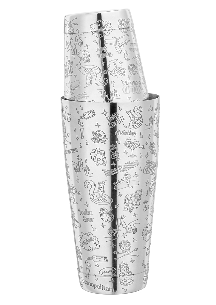 Специальная версия оловянного шейкера с выгравированными узорами, все сделано из нержавеющей стали очень хорошего качества. Дизайн этого шейкера был разработан в сотрудничестве с Мареком Послушни, представителем компании Fuchs, четырехкратным чемпионом мира по бармену.