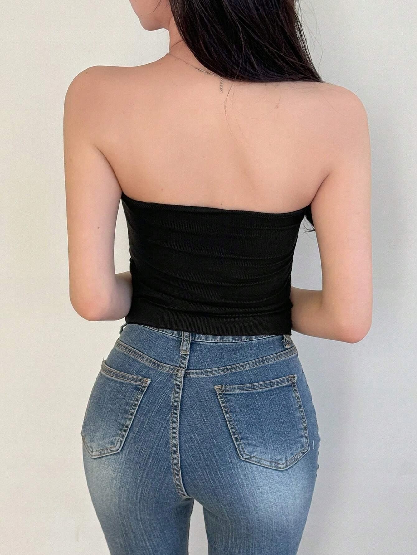 SHEIN ЧЕРНЫЙ ТОП В РЕБРИКУ С ДЕКОРАТИВНЫМИ ПУГОВИКАМИ XL 72545