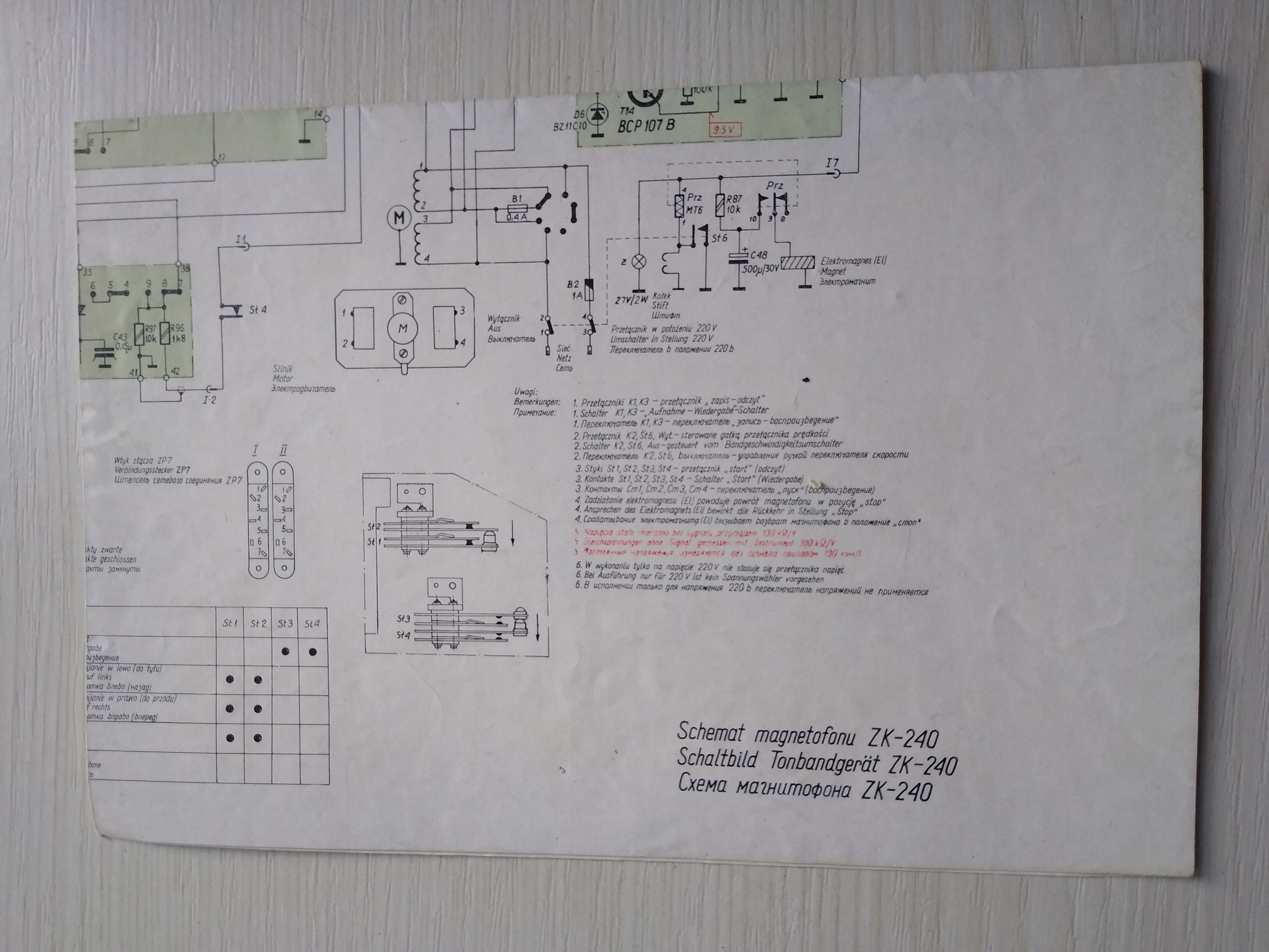 Приятная, красочная принципиальная схема магнитофона ЗК-240. Напряжения показаны красным цветом. Отправляю то, что на картинке.