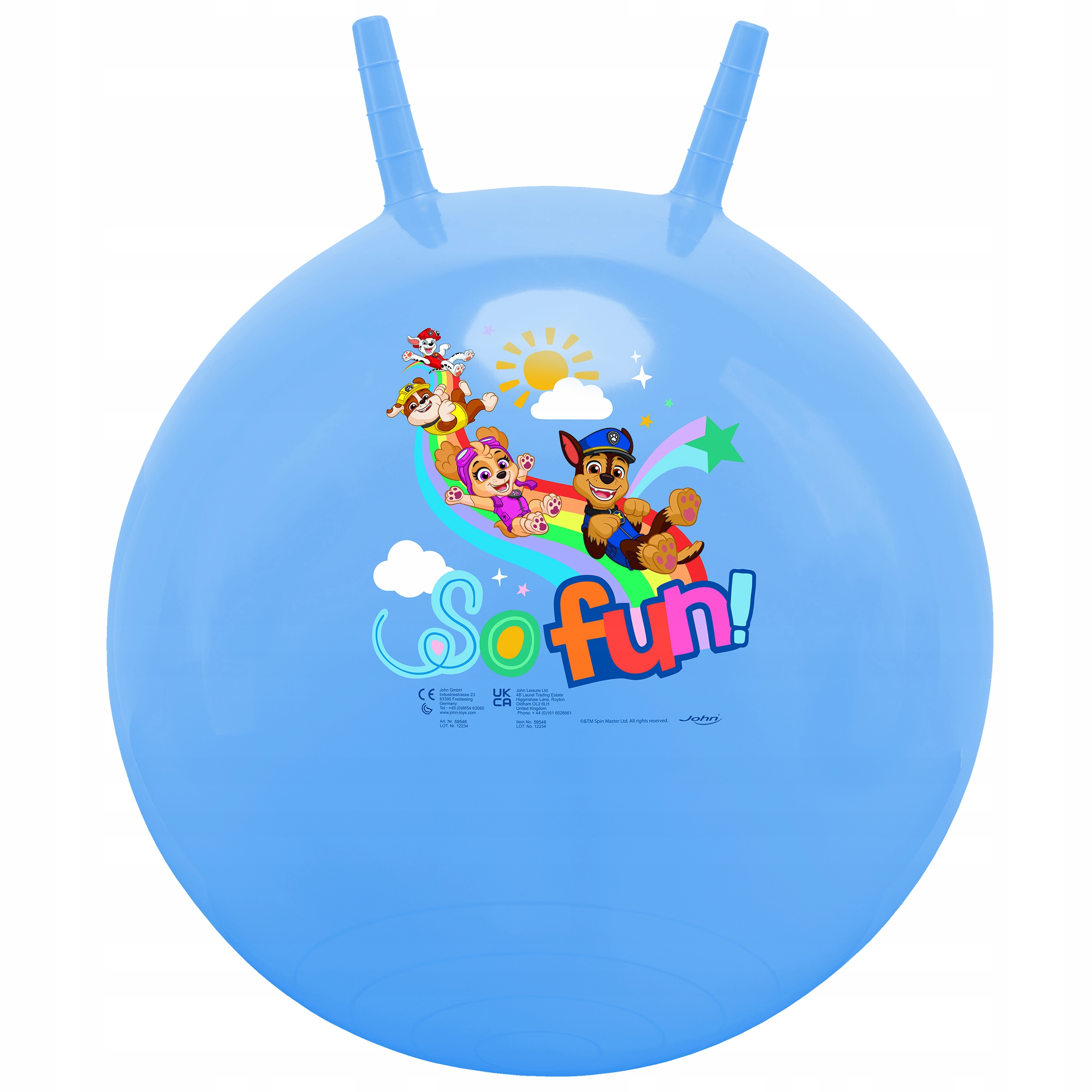 Прыгающий мяч синего и имеет два захватывающих рога. Он был украшен красочной графикой, на которой изображены главные герои мультфильма «Щенячий патруль», вступающие в бой — Райдер, Маршалл, Зума, Чейз, Раббл, Рокки и Скай.< / р>