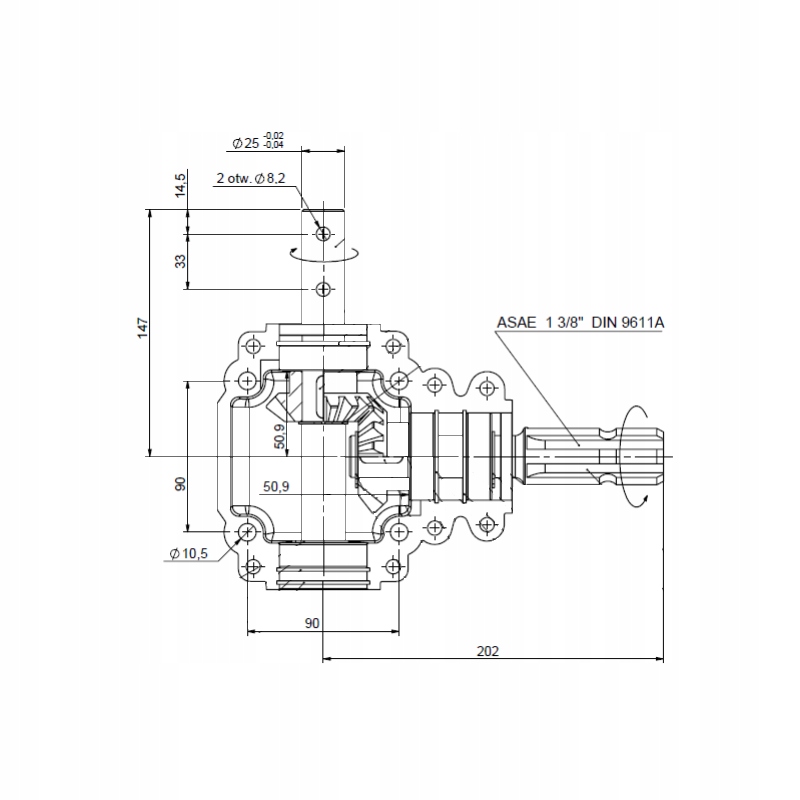 Высококачественная, прочная угловая передача в чугунном корпусе с коваными коническими шестернями на прямых зубьях. Применяется в воронкообразных разбрасывателях удобрений, однодисковых разбрасывателях удобрений, в том числе: ABRA, PRONAR, BRANDI, DEXWAL, GRASS-ROL, STRUMYK, WOPROL, JAR-MET L-150J, L150J.
