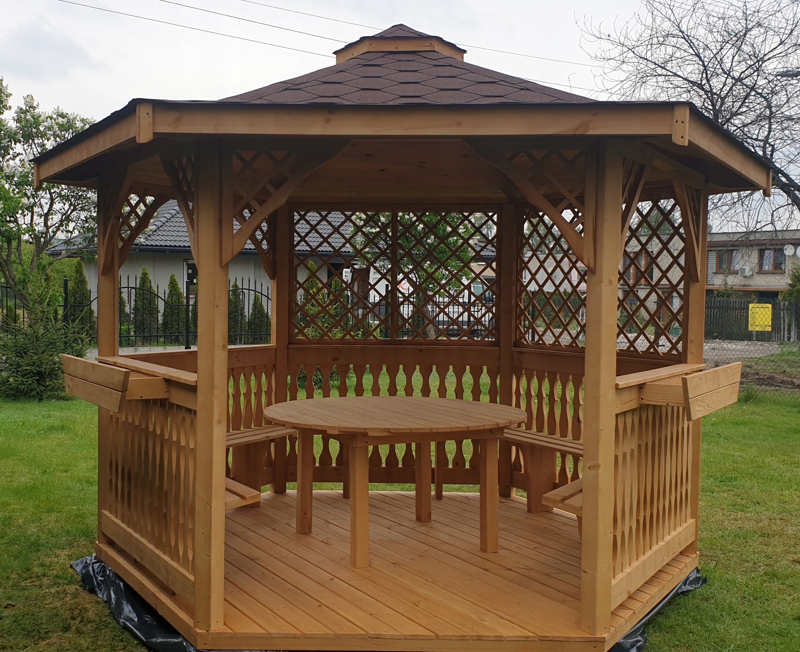 Деревянная садовая беседка диаметром 320 см. Идеально подходит для использования на рекреационных участках и в приусадебных участках. Высота шестов 195 см. Толщина опорных стоек 9х9 см. Толщина лаг под пол 5х5 см. Беседка изготовлена из древесины сосны, высушенной в печи до влажности 15%. Сушка обеспечивает защиту от синевы и грибков. Эти критерии оказывают существенное влияние и обеспечивают долговечность нашего продукта. Пол и крыша включены — полностью обшиты.