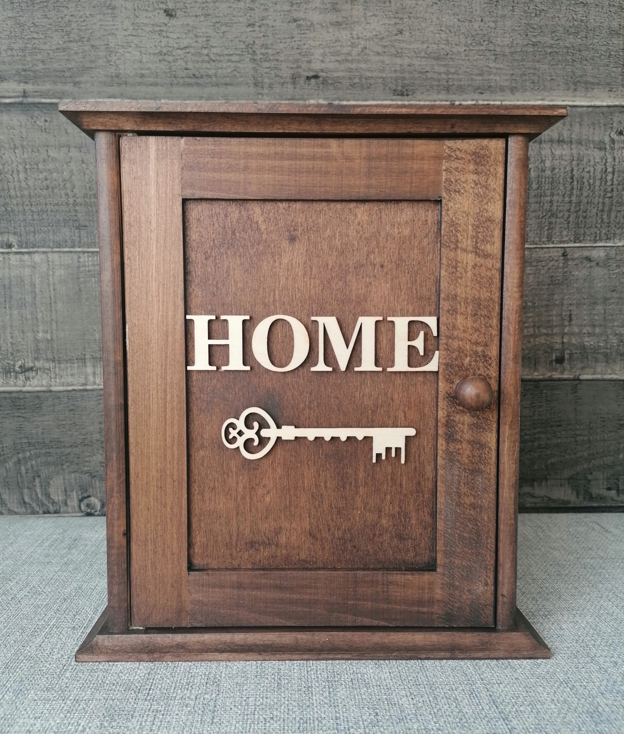 На дверцах шкафа имеется деревянная надпись. ДОМ и стилизованный ключ.