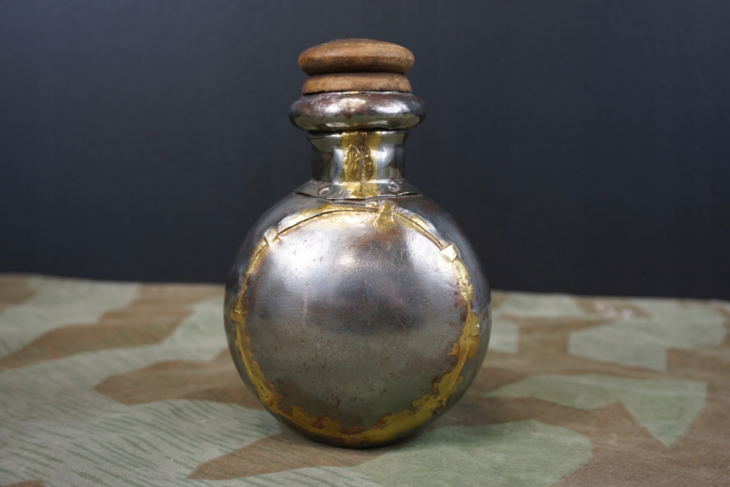 Столовая/контейнер для воды, Индия. Очень интересная поделка из металла. Локальные следы коррозии. Деревянная пробка. Высота со стопором 14,5см. Ширина 9 см.