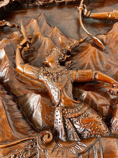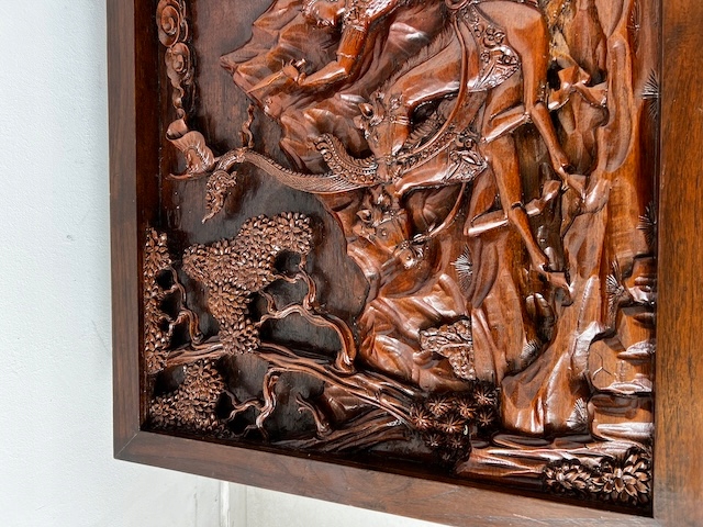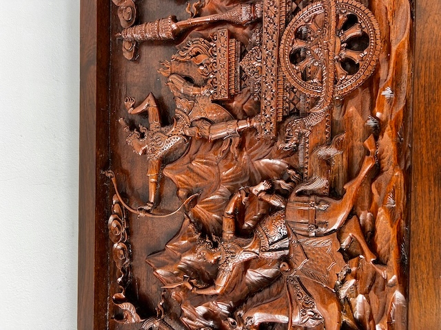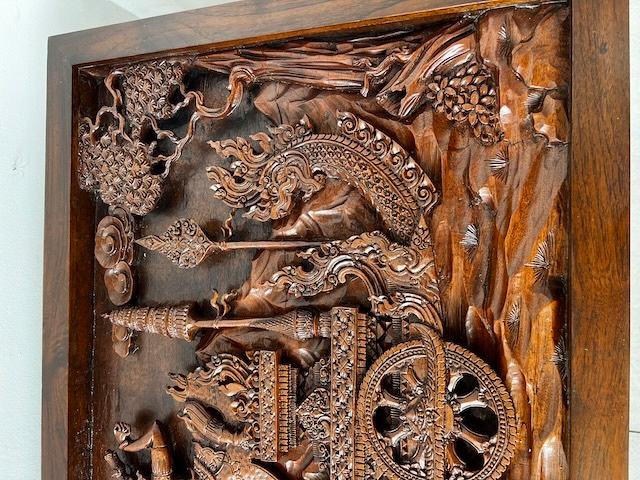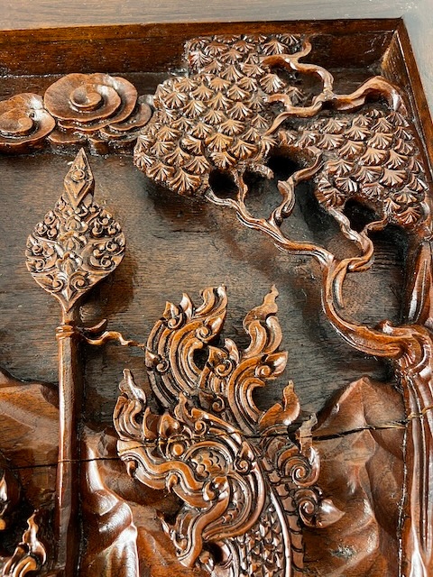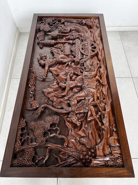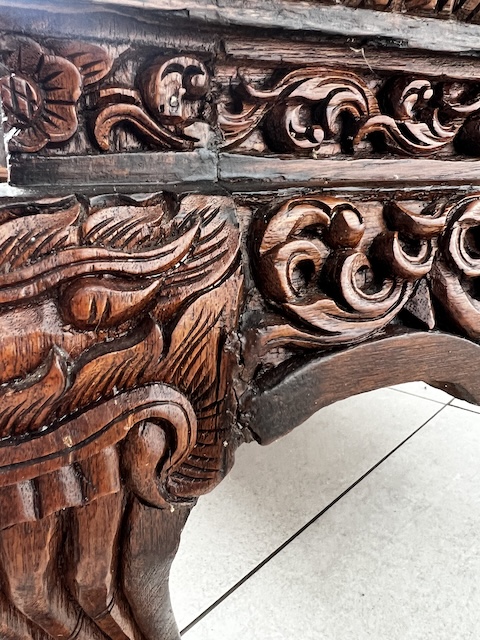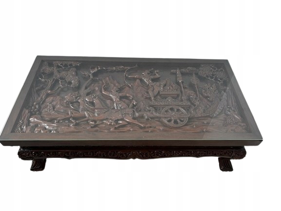 Восточная скамейка с резной вершиной. Он сделан из твердой экзотической древесины. Верх украшен ручной сценой, покрытой стеклом. Резьба очень точная и глубокая - они представляют лошадей, колесницы, воины и овощные фон. Вся скамейка богато украшена - также по бокам и на ногах. Профилированные ноги закончились лапами льва. Древесина имеет красивый, глубокий цвет и блеск. Мебель тяжелая, стабильная и уникальная - идеально подходит для интерьеров в восточном, классическом или колониальном стиле. Состояние скамейки подробно показано на изображениях. Он имеет типичные признаки использования. Готов вставить.