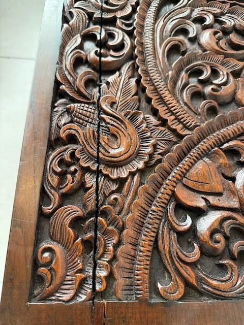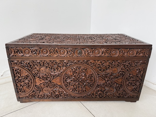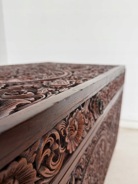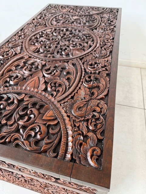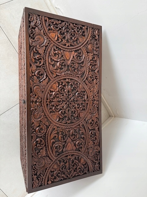 Восточная экзотическая древесная передача. Вырезанный вручную со страстью, не только воспоминания. Эффективно: богато украшены украшениями растений и геометрическими узорами, которые создают чрезвычайно декоративное целое. Это не только практическое место для хранения, это также оригинальное украшение, которое впечатляет мастерство. Это в хорошем состоянии. В возрасте существует естественный масштаб, и это единственный недостаток. Ее состояние подробно показано на картинках. Готов к использованию.