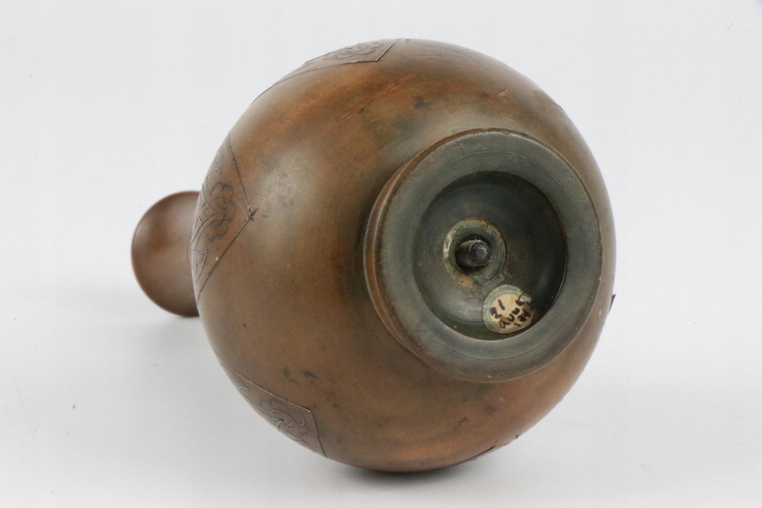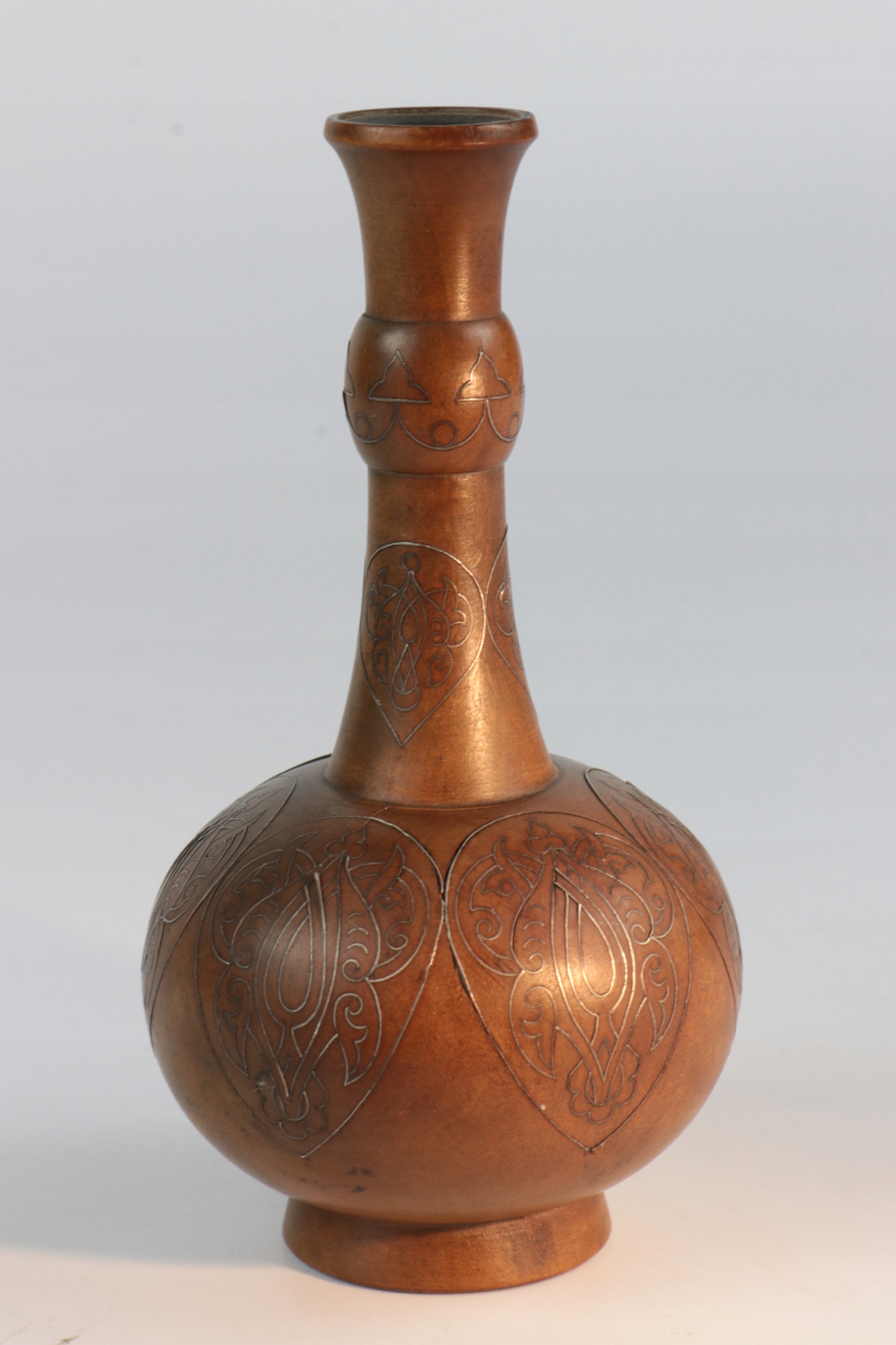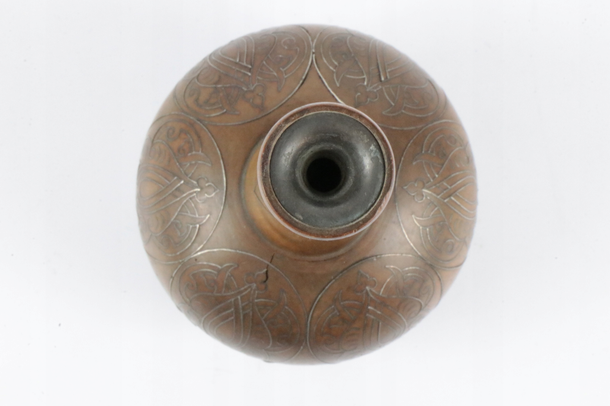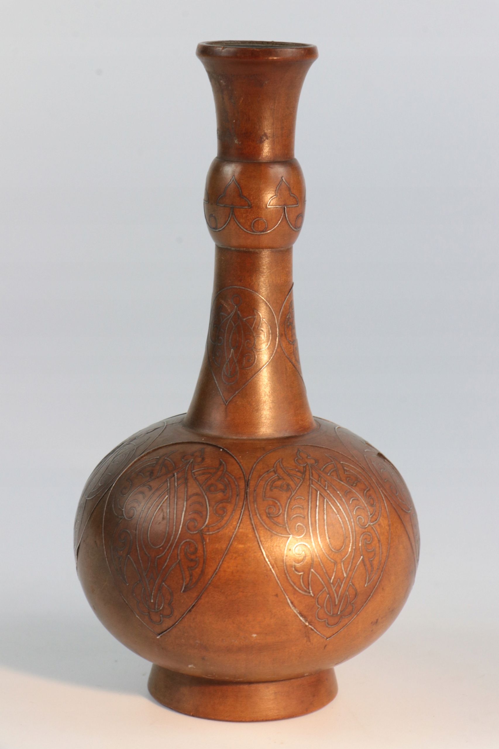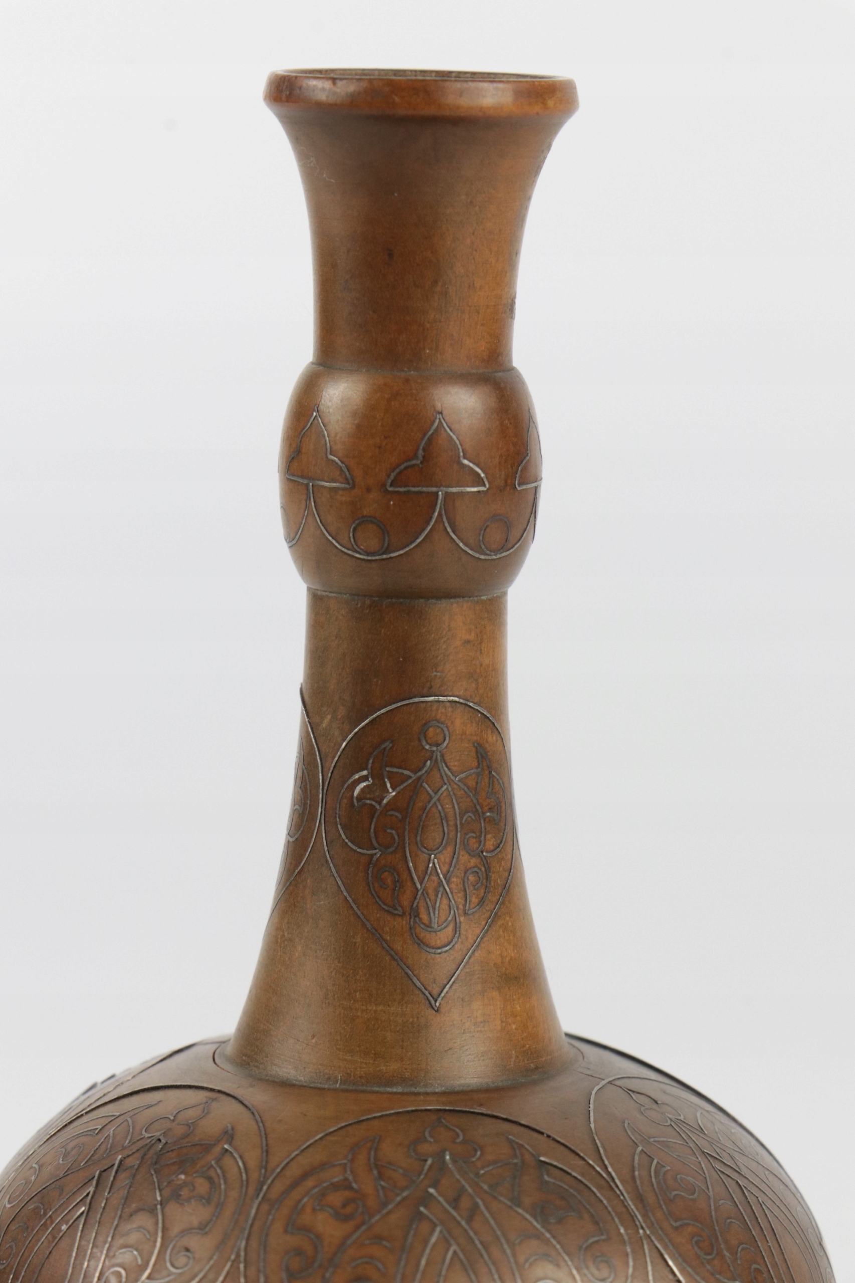 Интересная небольшая ваза, инкрустированная серебром в красивый геометрический восточно-исламский узор. Ваза из дерева. Узор инкрустации очень сложный. Внутри вазы вроде бы какая-то вставка и снизу видна резьба?