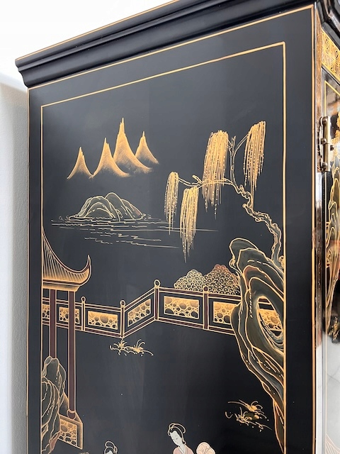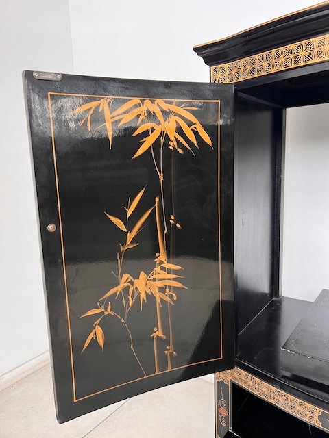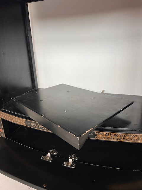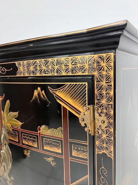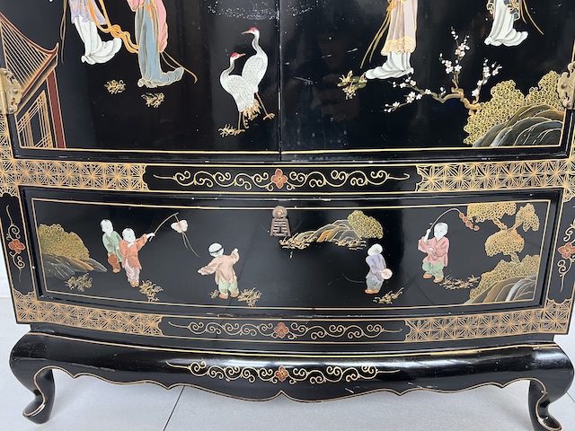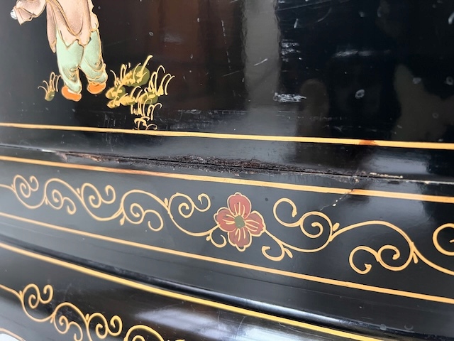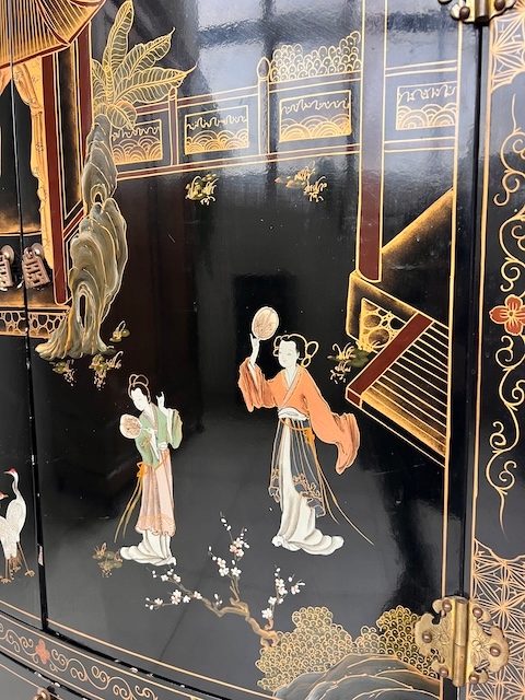 Восточный комод. Гламурный. Она изготовлена в лаковой технике и расписана вручную. Он трансформируется в комод под телевизор. Комод имеет следы использования. Его состояние подробно показано на фотографиях. Он готов к вставке.