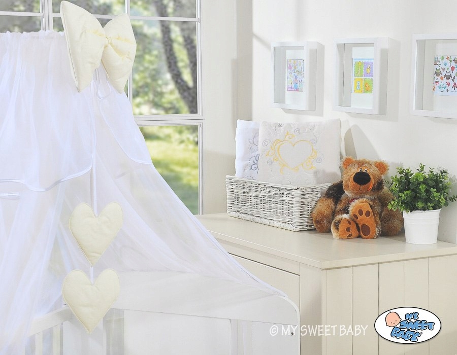 Два подвесных сердечка + большой толстый бант. Два подвесных сердечка с мягким наполнением станут милым и неповторимым дополнением комплекта постельного белья. Они привлекают внимание малыша в первые месяцы жизни, эффективно заменяя мобиль. Большой, толстый бант — прекрасное завершение всего.