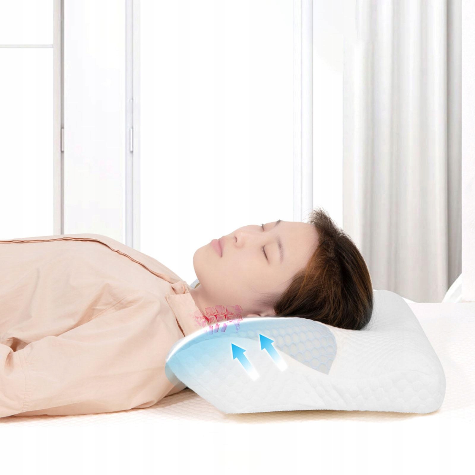 Эта подушка для шеи помогает поддерживать правильное положение во время сна, давление на голову и плечи может быть равномерно распределено, чтобы облегчить болезненность позвоночника и задней части шеи и плеч.
