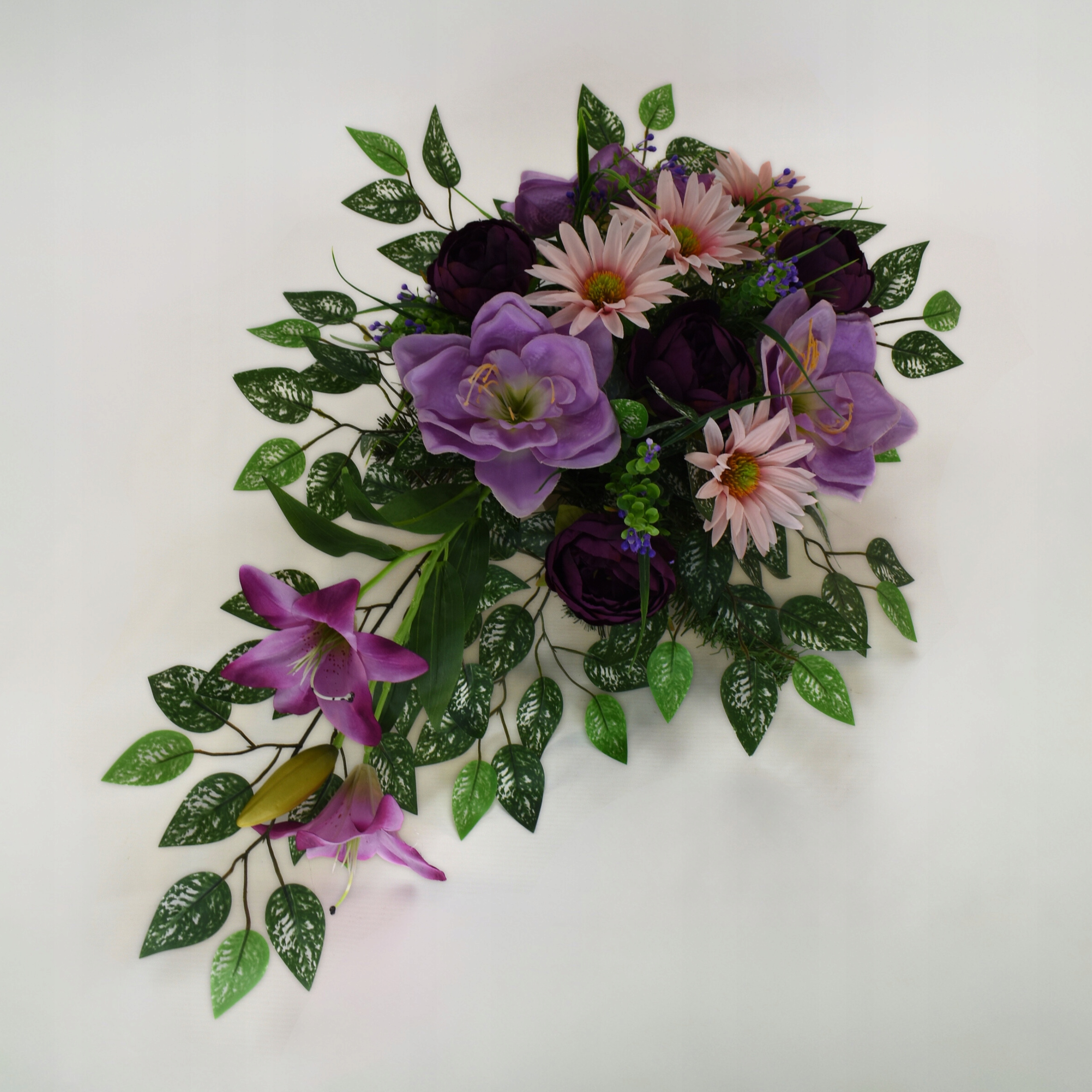 Композиция состоит из искусственных цветов лилий, эхинацеи, пионов и кливии в фиолетовых оттенках, дополненный аксессуарами и зелеными листьями, весь комплект помещен в горшок, залитый бетоном для обеспечения устойчивости.