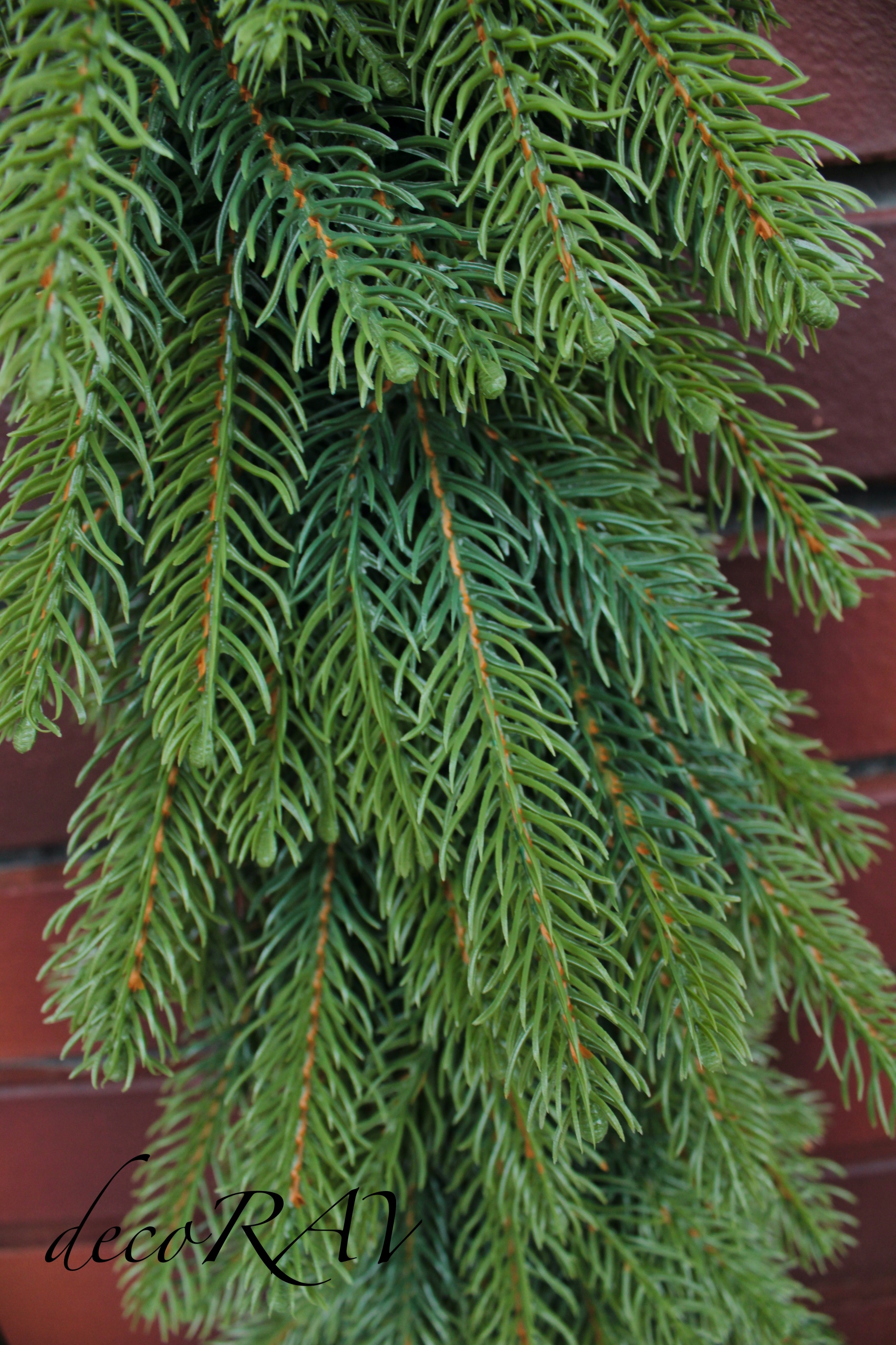 Гирлянда выглядит очень реалистично. Для ее изготовления использованы веточки, напоминающие живые еловые веточки.