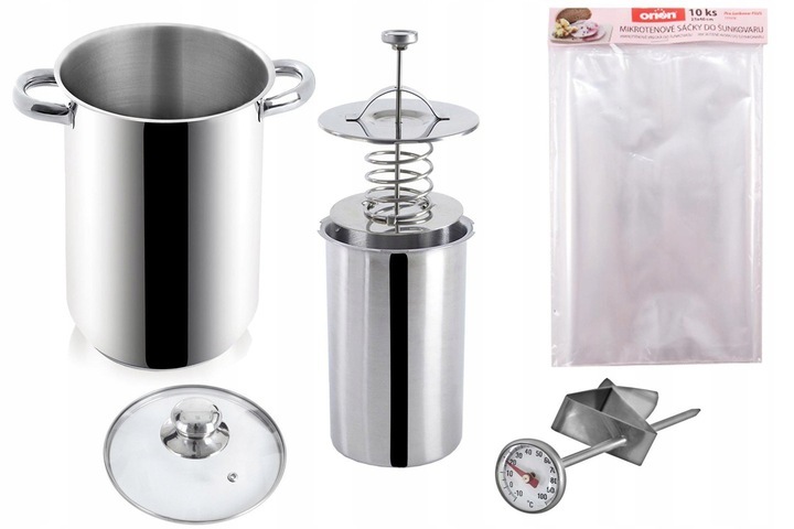 - В комплект входит специальная высокая кастрюля из нержавеющей стали с крышкой емкостью 5,2 л, в которую мы помещаем предварительно заполненную ветчинницу.