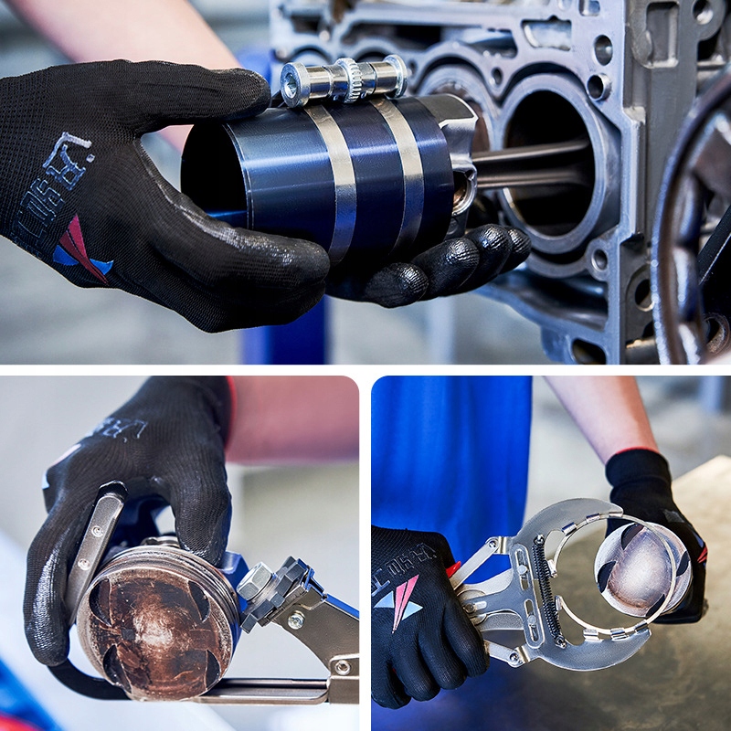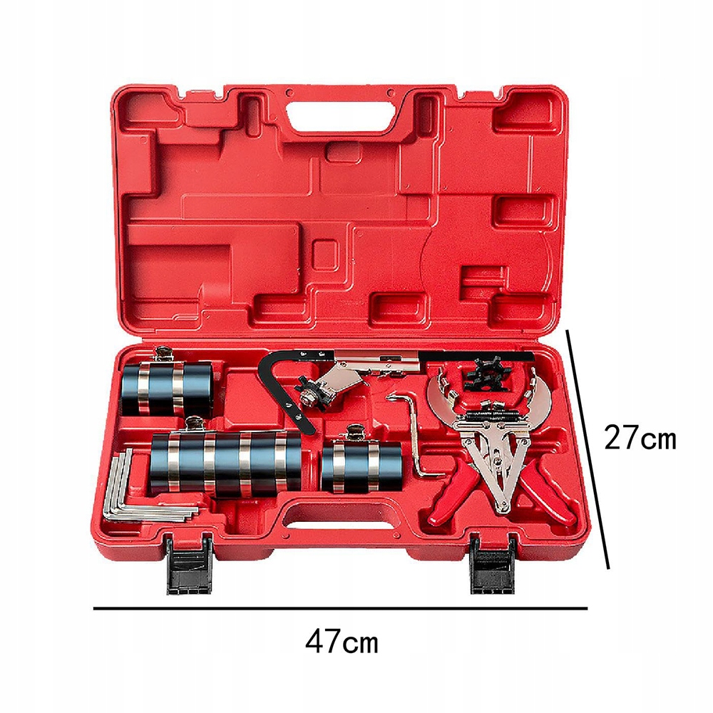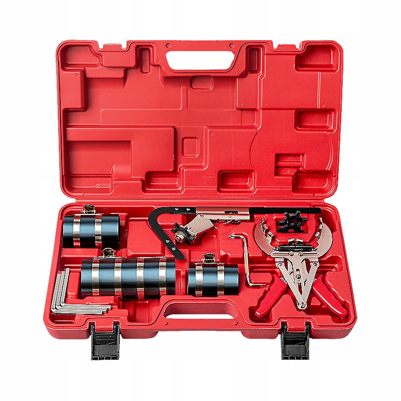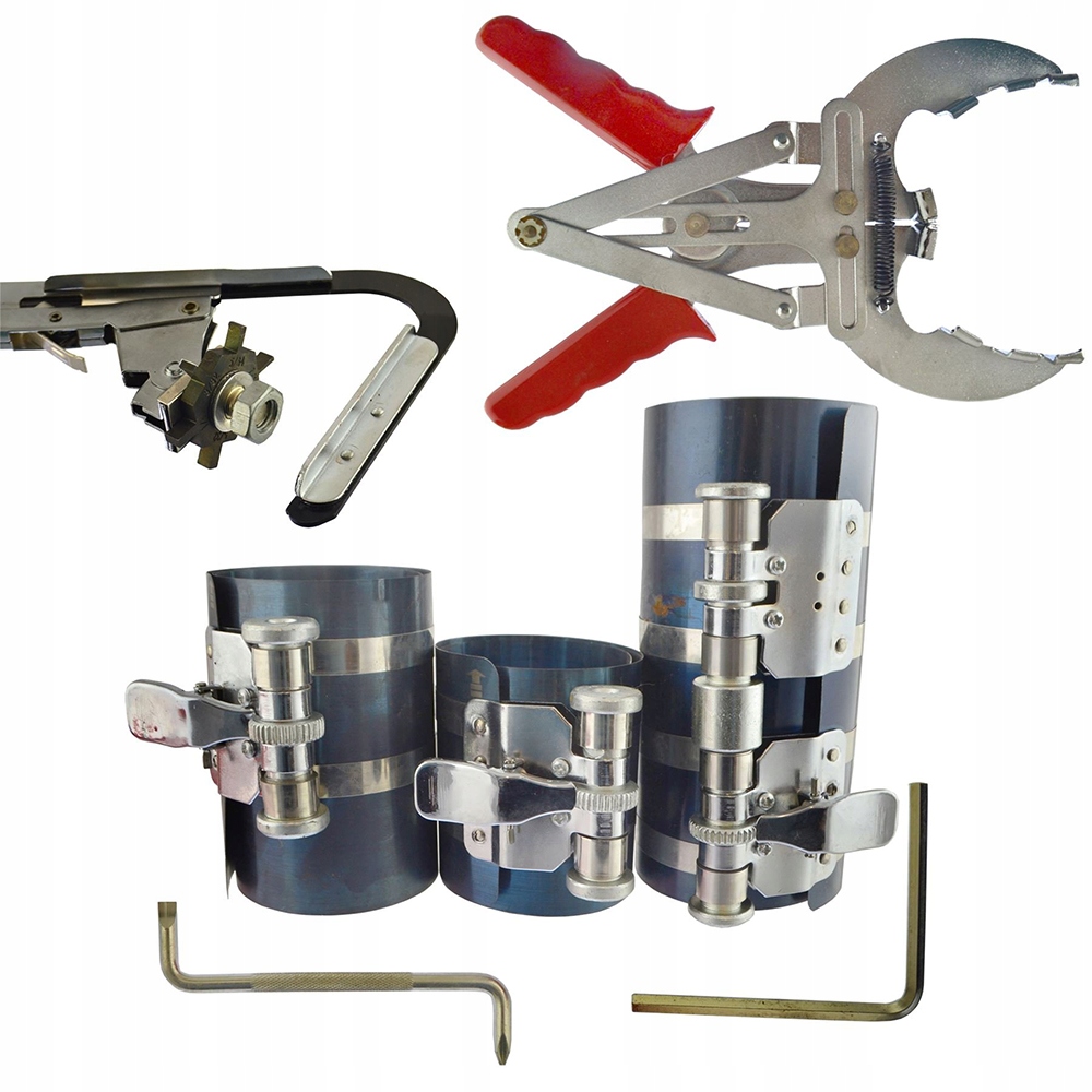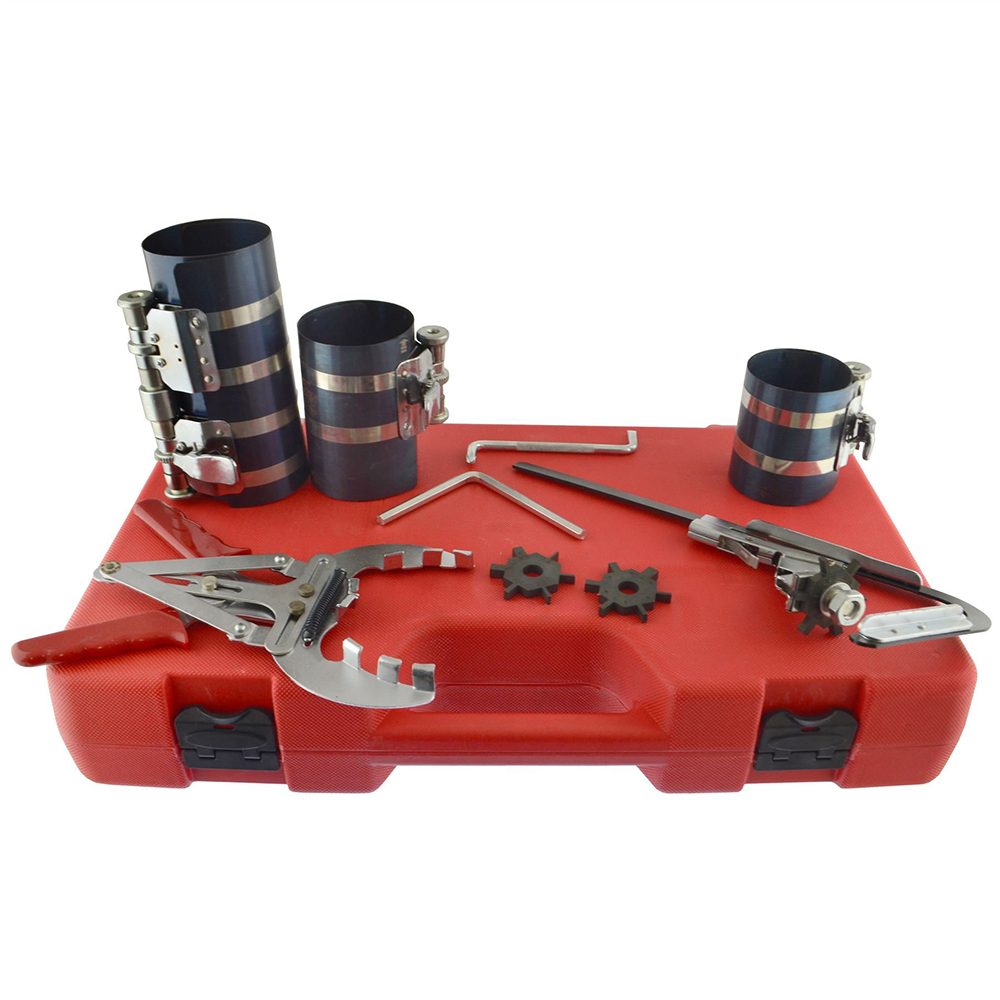 Практический набор инструментов состоит из набора фиксаторов для поршневых колец различного размера, клещей с рабочим диапазоном 50-100 мм и специального приспособления со сменными лезвия для чистки канавок поршня. Модель также поставляется в комплекте с чемоданом для удобной транспортировки.
