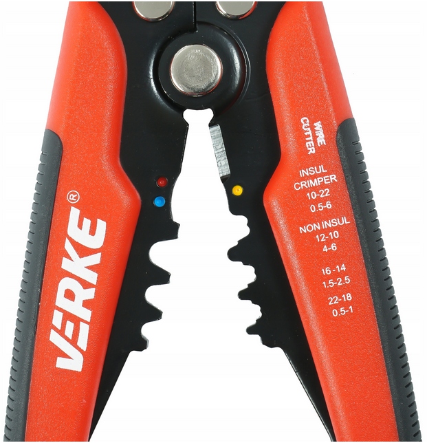 Щипцы с набором изолированных разъемов. Ручки защищены двухкомпонентными пластиковыми чехлами. Конструкция плоскогубцев позволяет снимать изоляцию как с концов, так и с середины провода. Ограничитель глубины полезен при прокладке кабелей, например, в разъемах или весовых кубах.