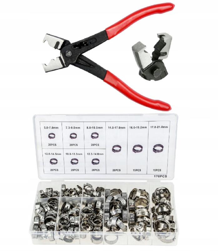 - Содержимое комплекта зажимы x170 (Ø5,8-7 мм x20, Ø7,3-9 мм x20, Ø8,8-10,5 мм x20, Ø10,8-13,3 мм x20, Ø12-14,5 мм x20, Ø12,3-14,8 мм x20, Ø14,5-17 мм x20, Ø16-19,2 мм x15, Ø17,8-21 мм x15)