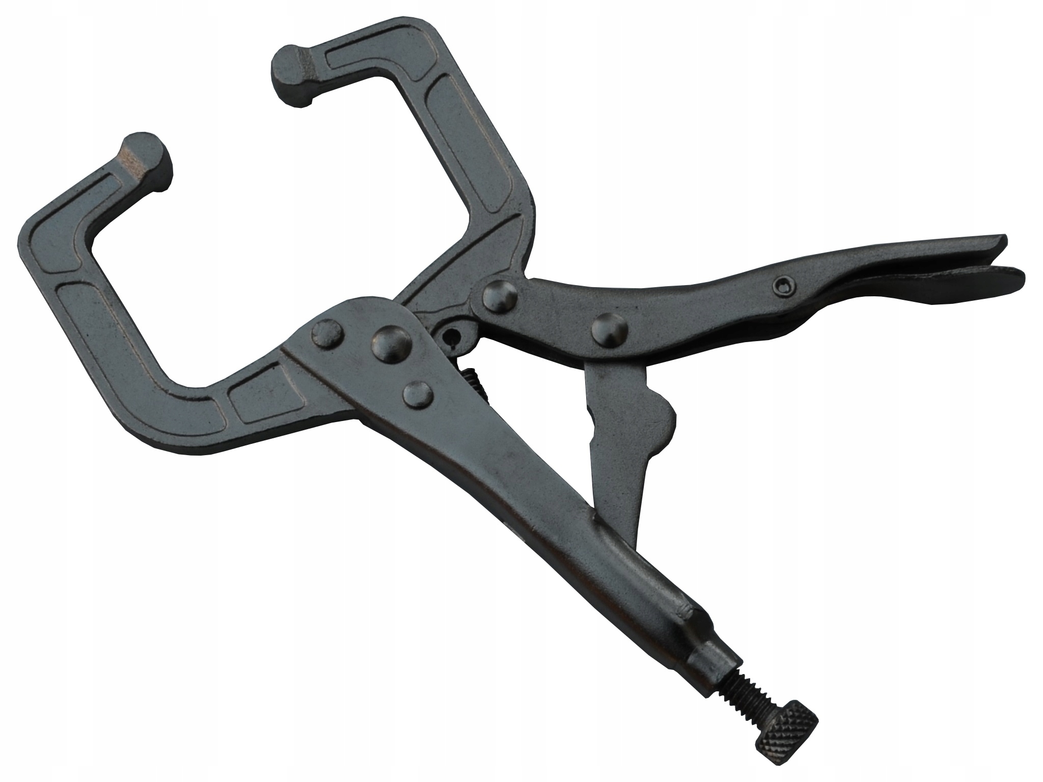 Стальные плоскогубцы с большой пряжкой. Они позволяют осуществлять быстрое точечное сжатие материалов при сверлении, сварке и клепке. Форма пряжки позволяет зажимать материалы различной формы.