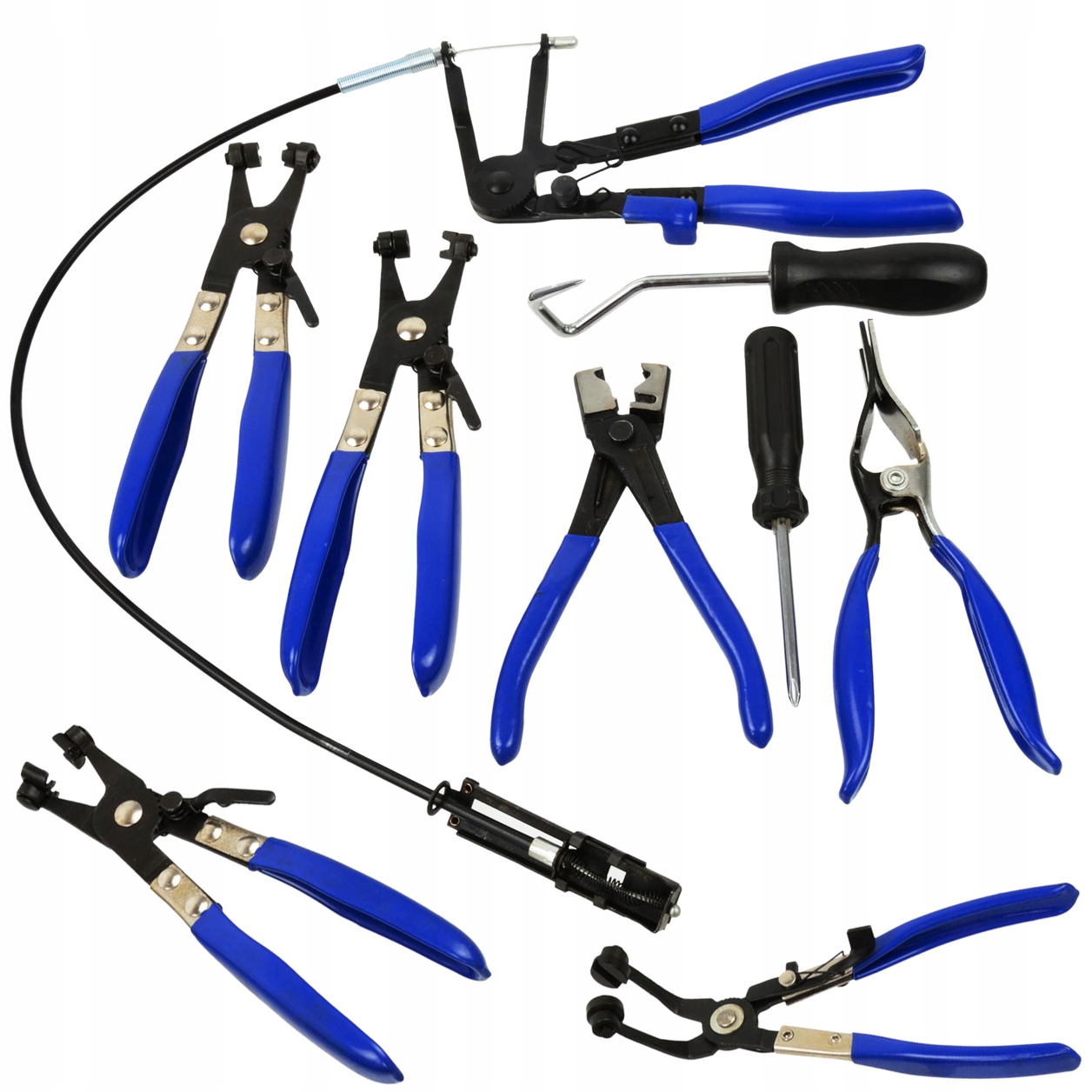 Богатый набор плоскогубцев позволяет сборка и разборка ленточных стяжек., хомуты крышек шарниров, хомуты «клик» и «клик-р», а также клещи для демонтажа топливопроводов, вакуумных магистралей и т. д.