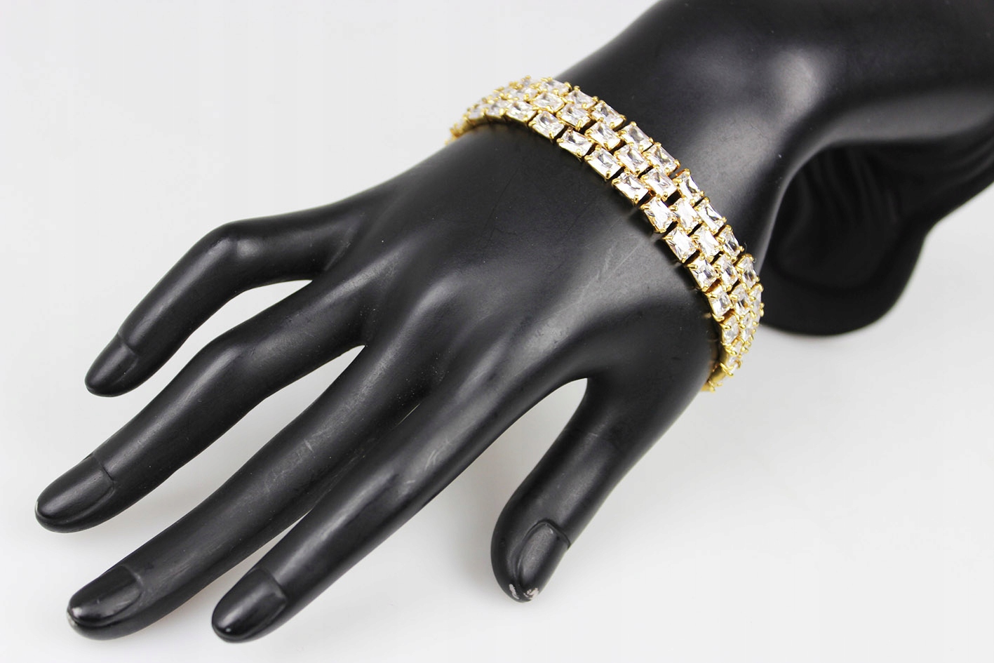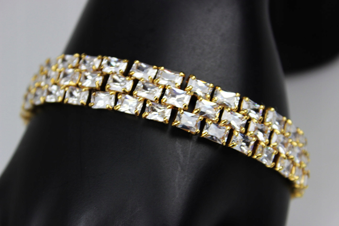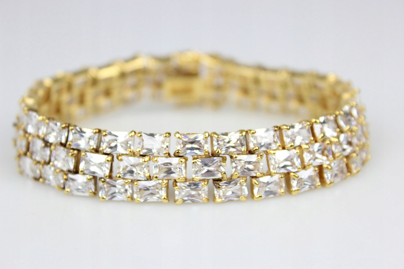 Широкий три браслета, стилизованный как ар -деко. Продукт 1980 -х годов, изготовленный в Golden 925 Образец серебряного и интимного с блестящими камнями из аспектов в виде багет. Двойная защита ящика. Состояние очень хорошее. Размеры: