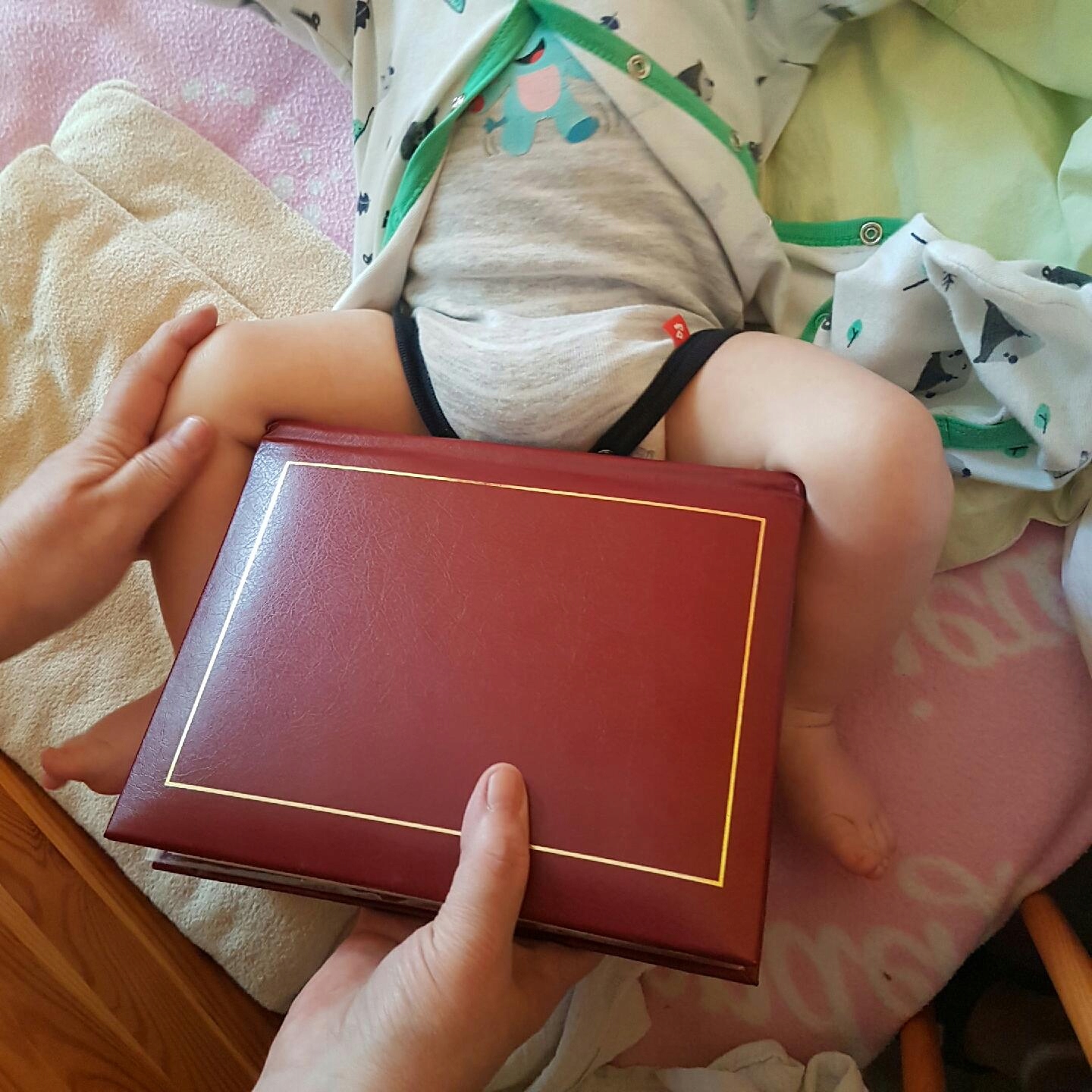 Проверьте, насколько широко книжка полностью заполняет пространство между коленями ребенка. Расположите книгу как на фото.
