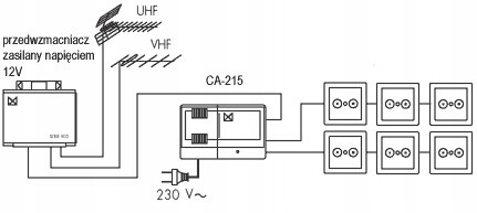 Усилитель CA-215 используется в качестве абонентского усилителя для распределения сигнала на несколько-десяток приемников. Основной особенностью усилителя является его работа в диапазонах 40 – 400 МГц и 470 – 862 МГц. Благодаря независимой регулировке усиления в УКВ и УВЧ диапазоне можно подстроить усиление под уровень сигнала в заданном диапазоне. Это облегчает построение антенных установок с использованием одного кабеля для вывода сигналов со всех антенн (после суммирования с помощью диплексера или комбинированной антенны).
