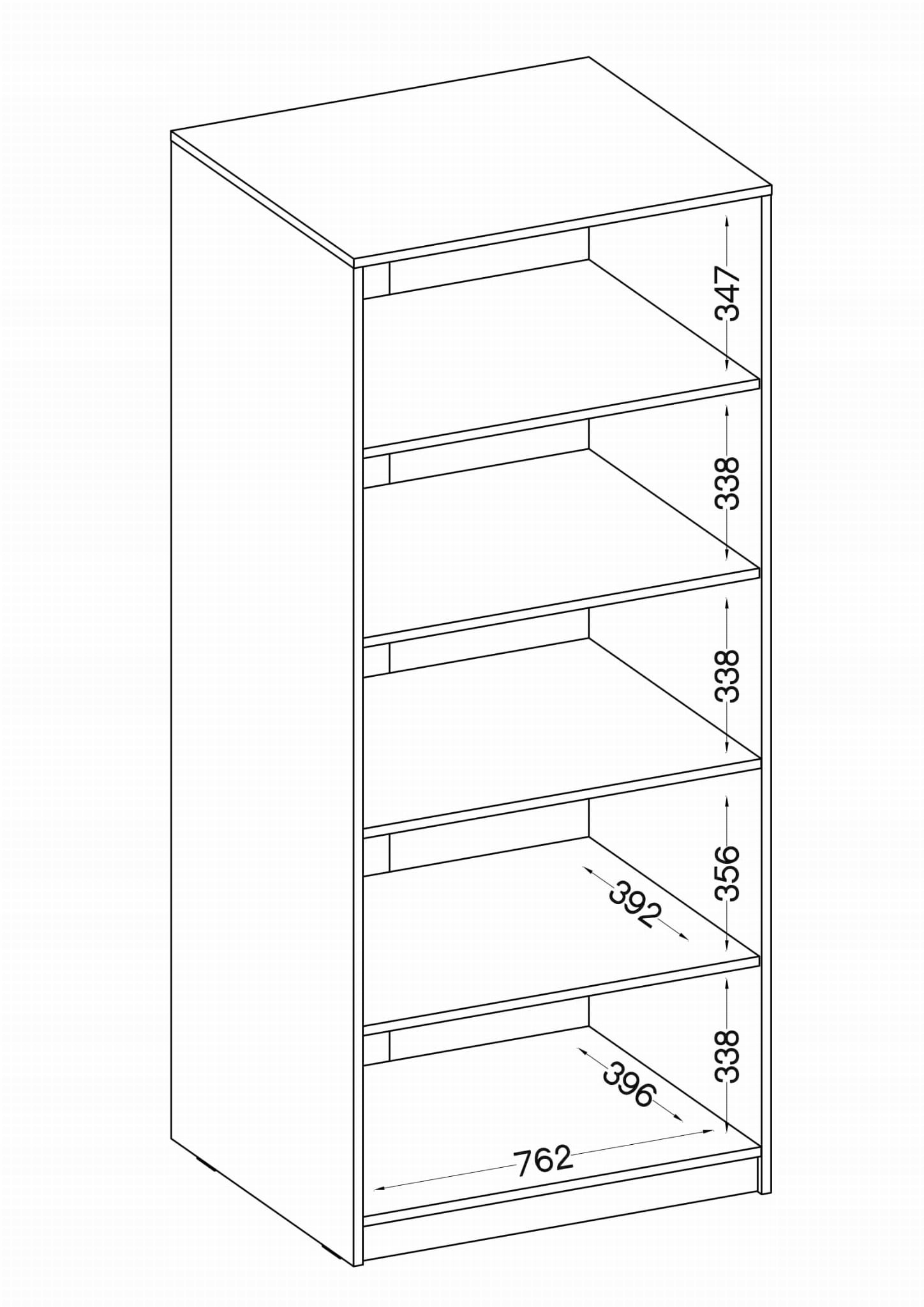 - Пять открытых полок размерами 762x338x392 мм (ширина х высота) x глубина)